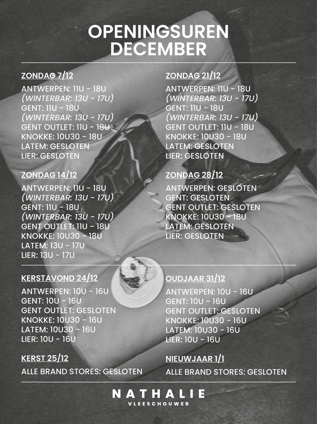 In december ben je extra vaak welkom in onze brand stores om jouw feestoutfit of cadeaus te shoppen. Onze teams staan nu ook op zondag voor je klaar.