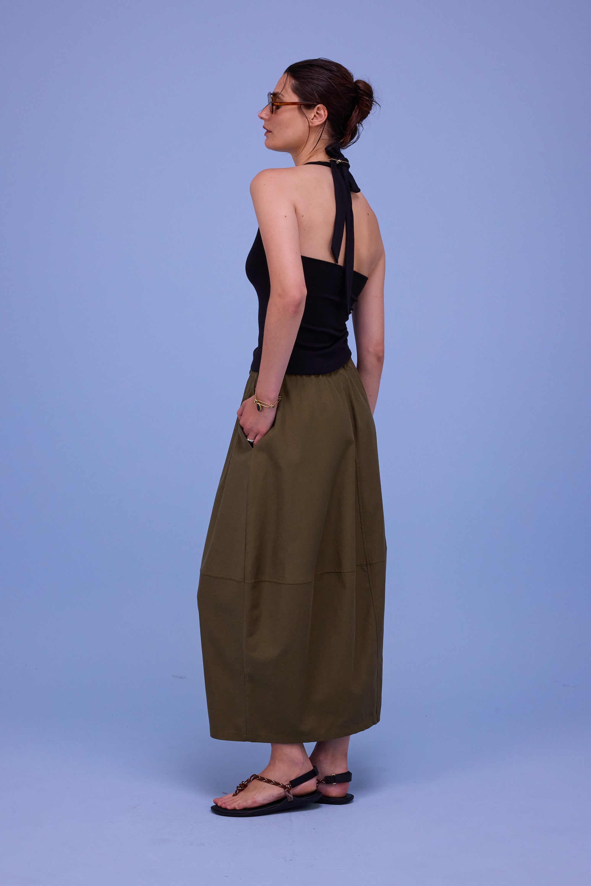 Haltertop in jersey ribkatoen. De stijl is terug van weggeweest en brengt je instant in zomer-vibe.