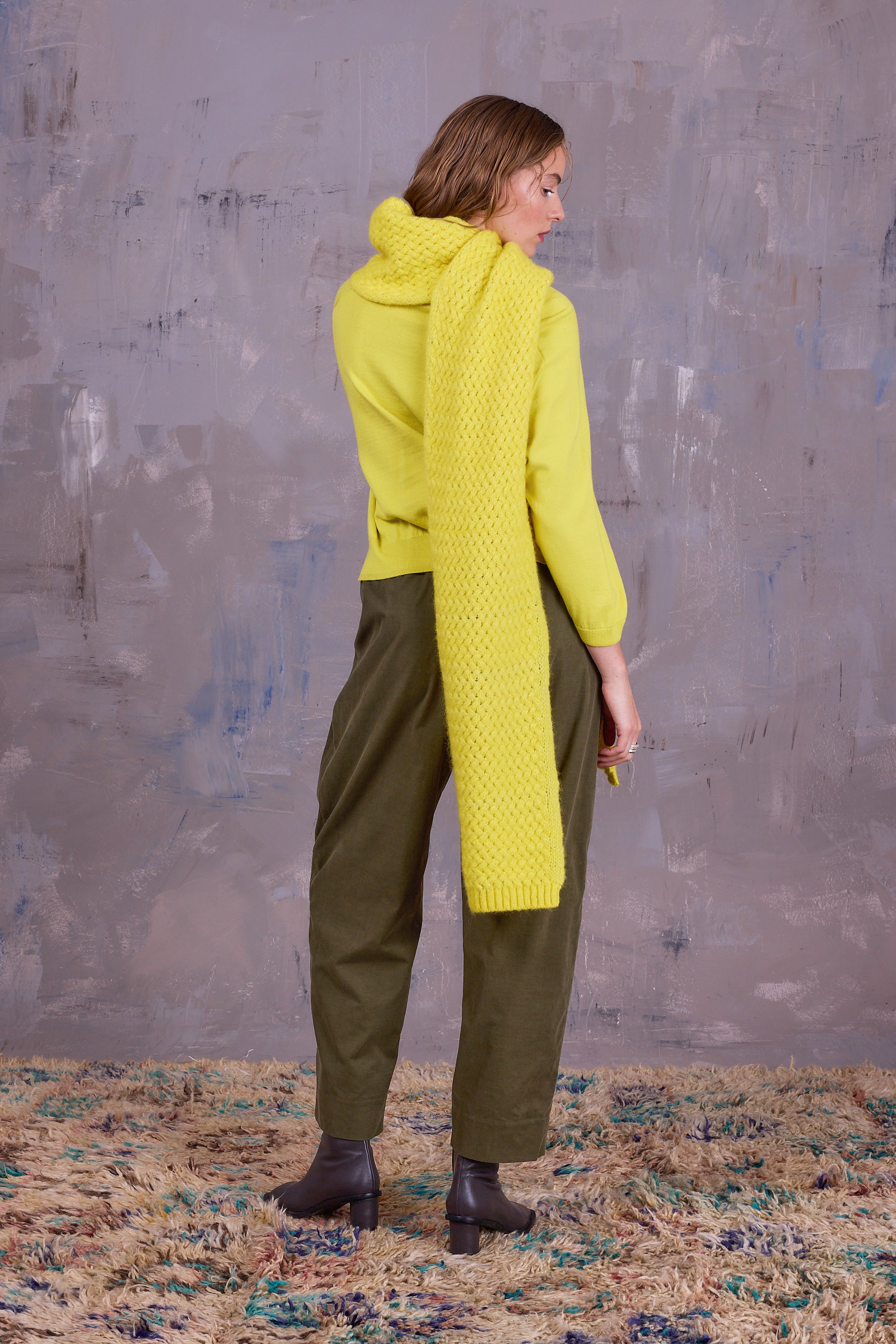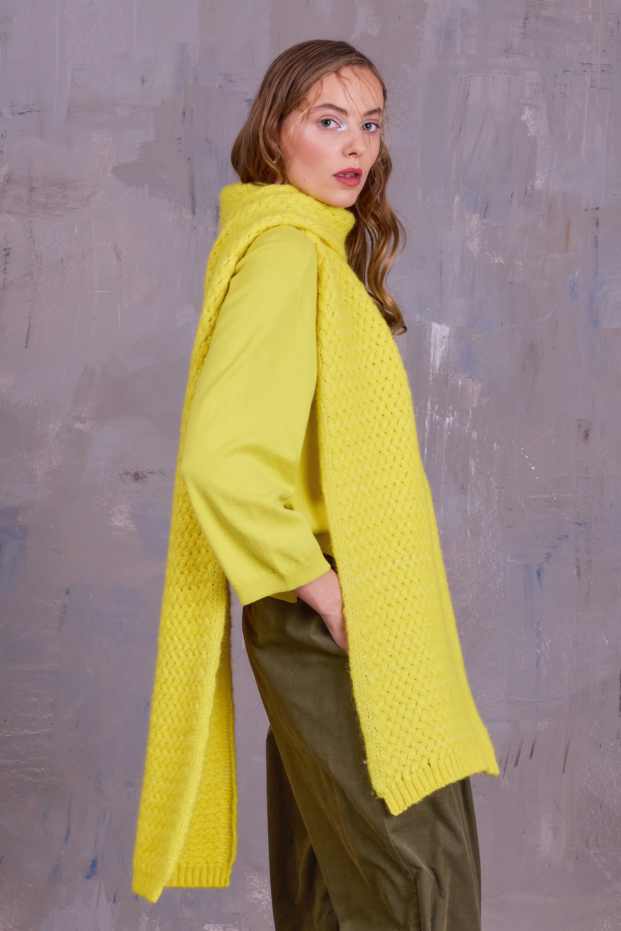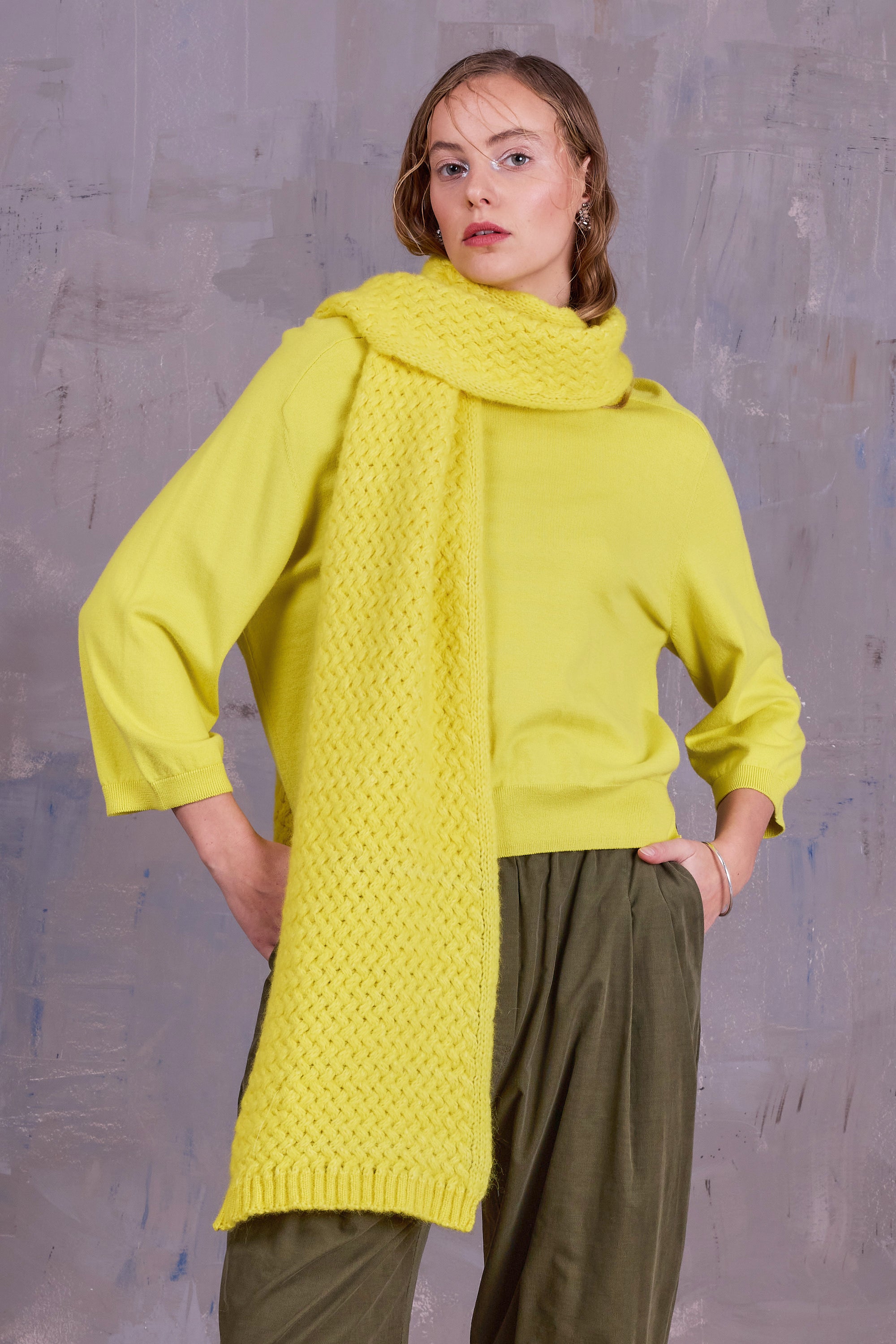 Sjaal met geweven patroon, gebreid in België in een donzig garen: een 100% natuurlijke mix van baby alpaca, katoen en merinowol.