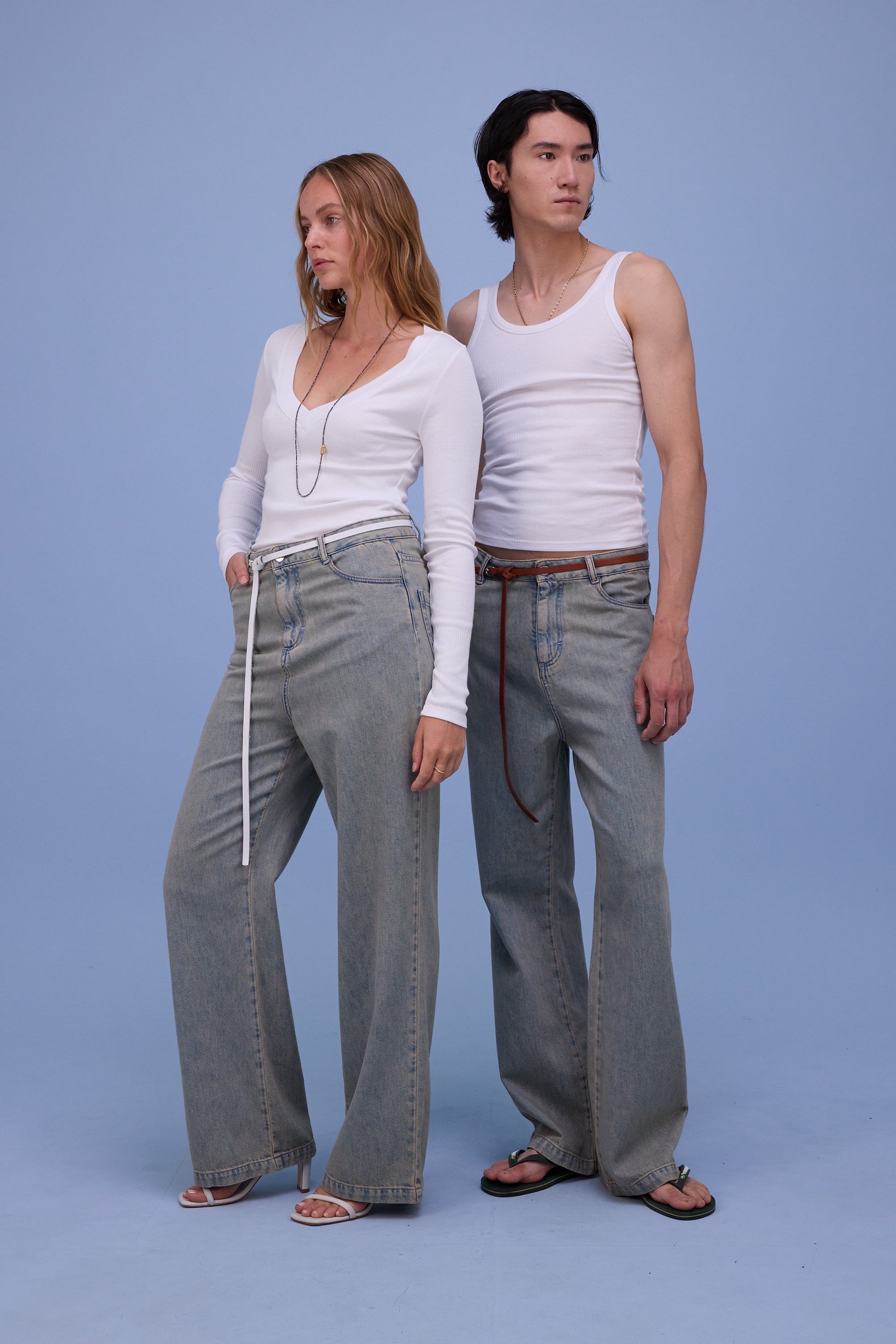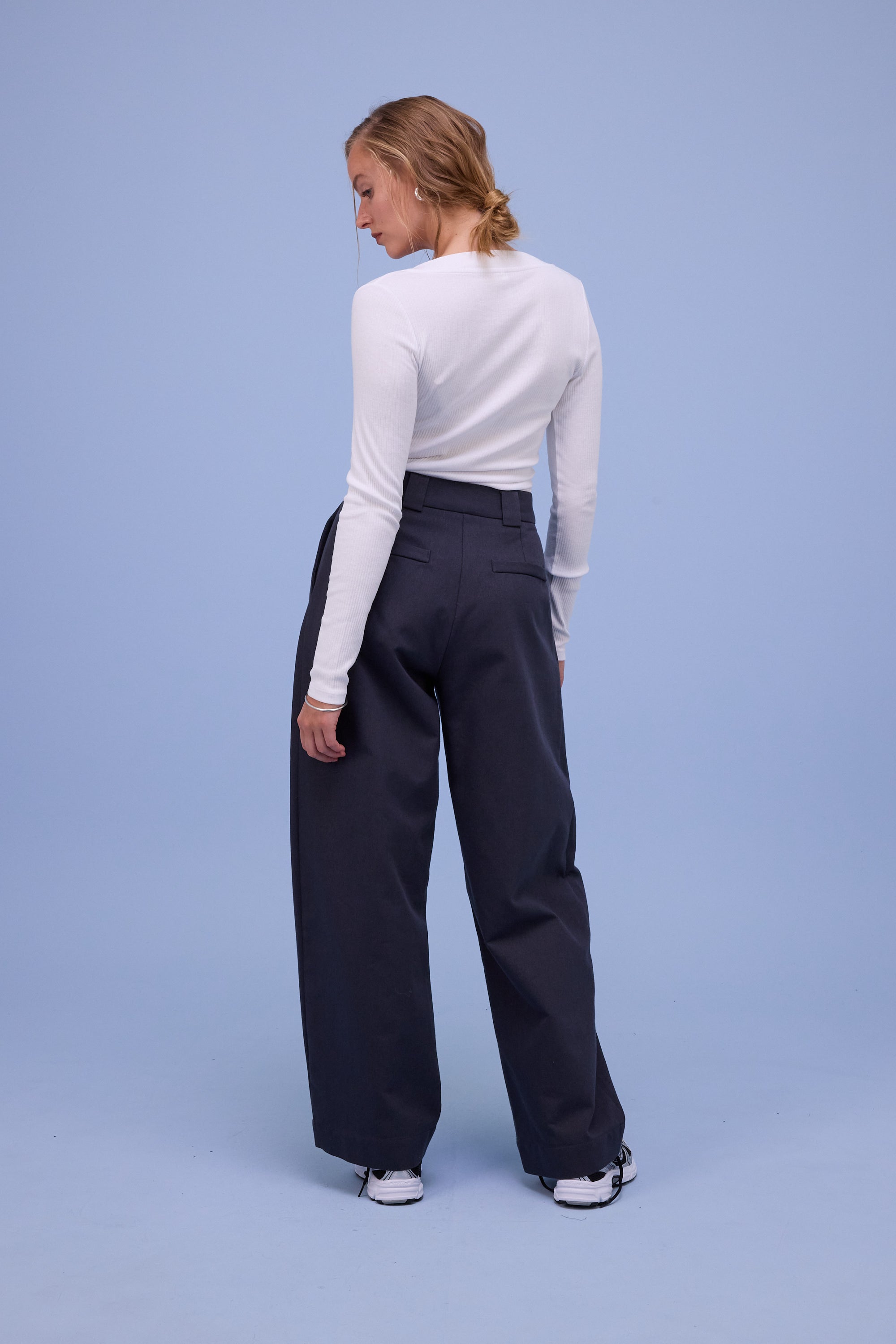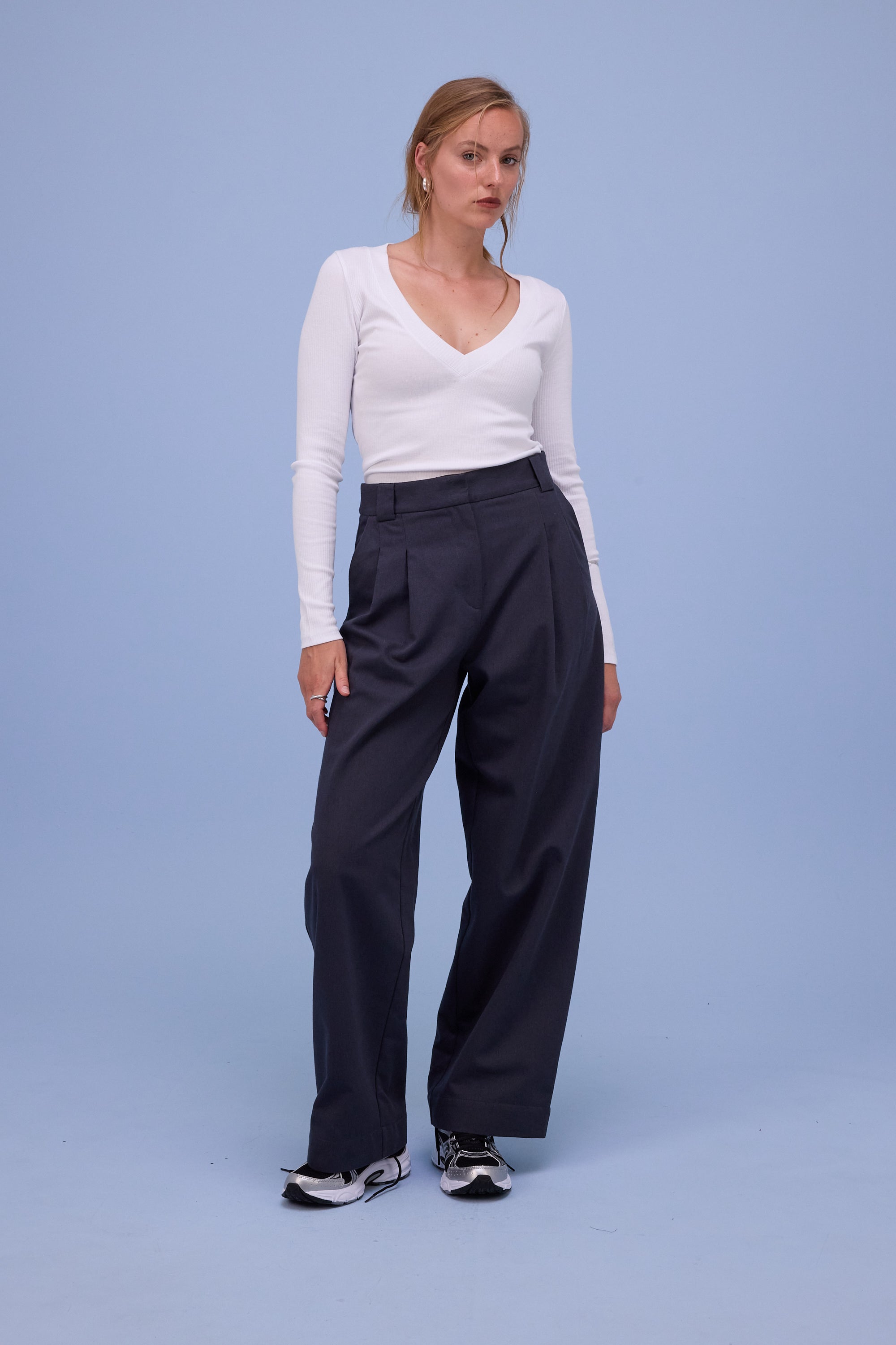 Aanpassend T-shirt in ribkatoen blend met brede boordafwerking aan de diep uitgesneden V-hals.