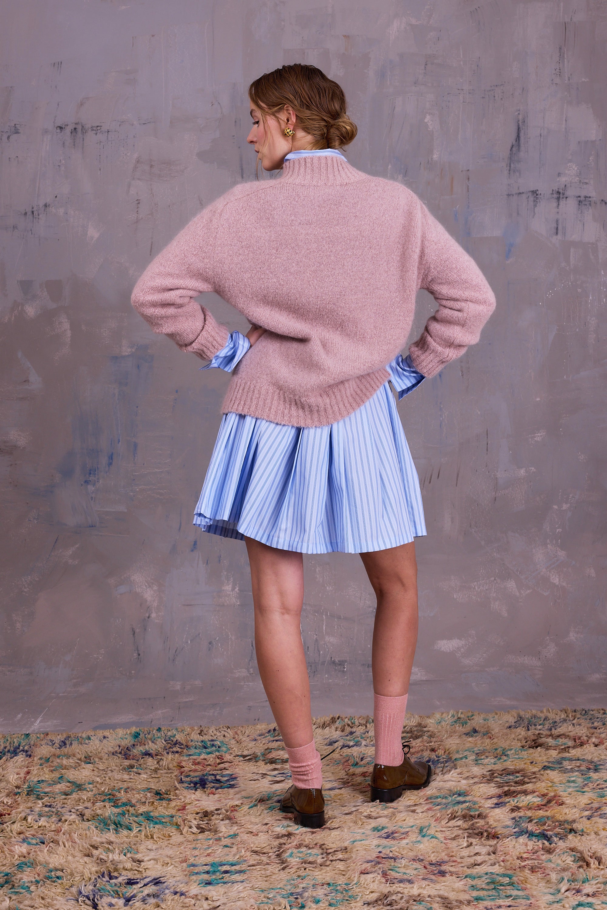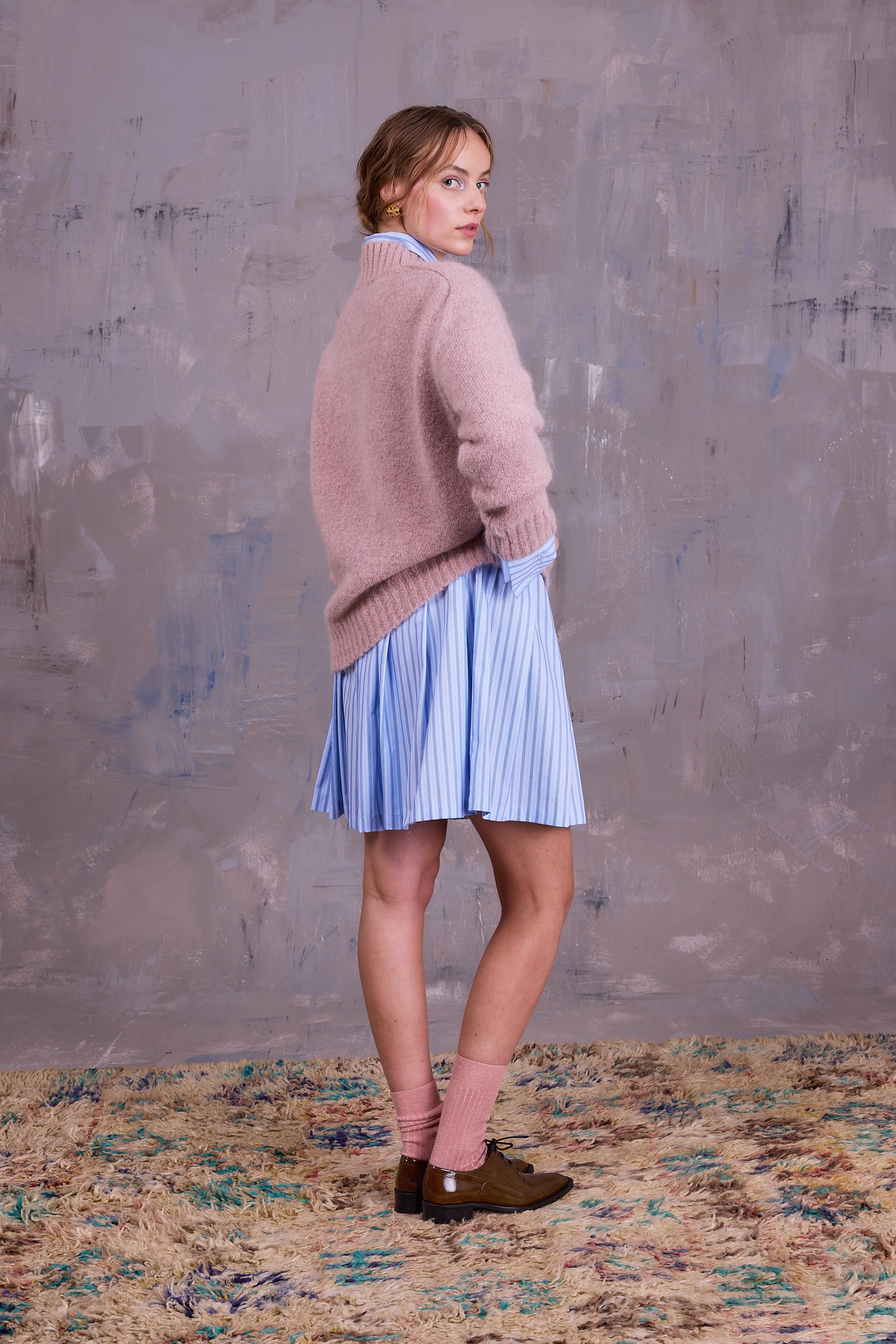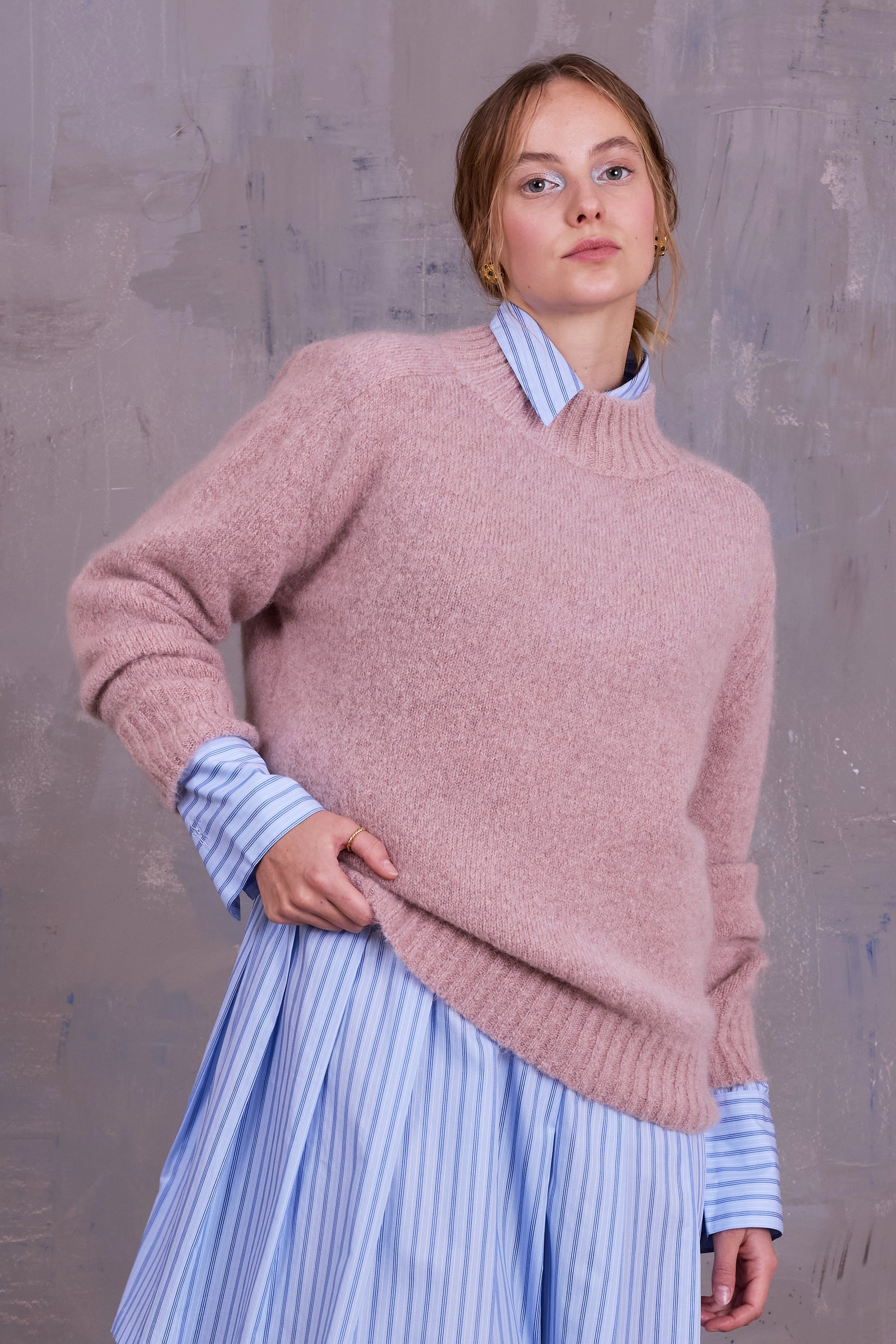 Oversized Pullover mit Stehkragen und Hammerschlagärmeln in einer herrlich warmen Mischung aus Mohair und Merinowolle, gestrickt in Belgien. Der Stehkragen ist niedrig genug, um noch ein Hemd darunter tragen zu können, perfekt für einen Lagenlook.