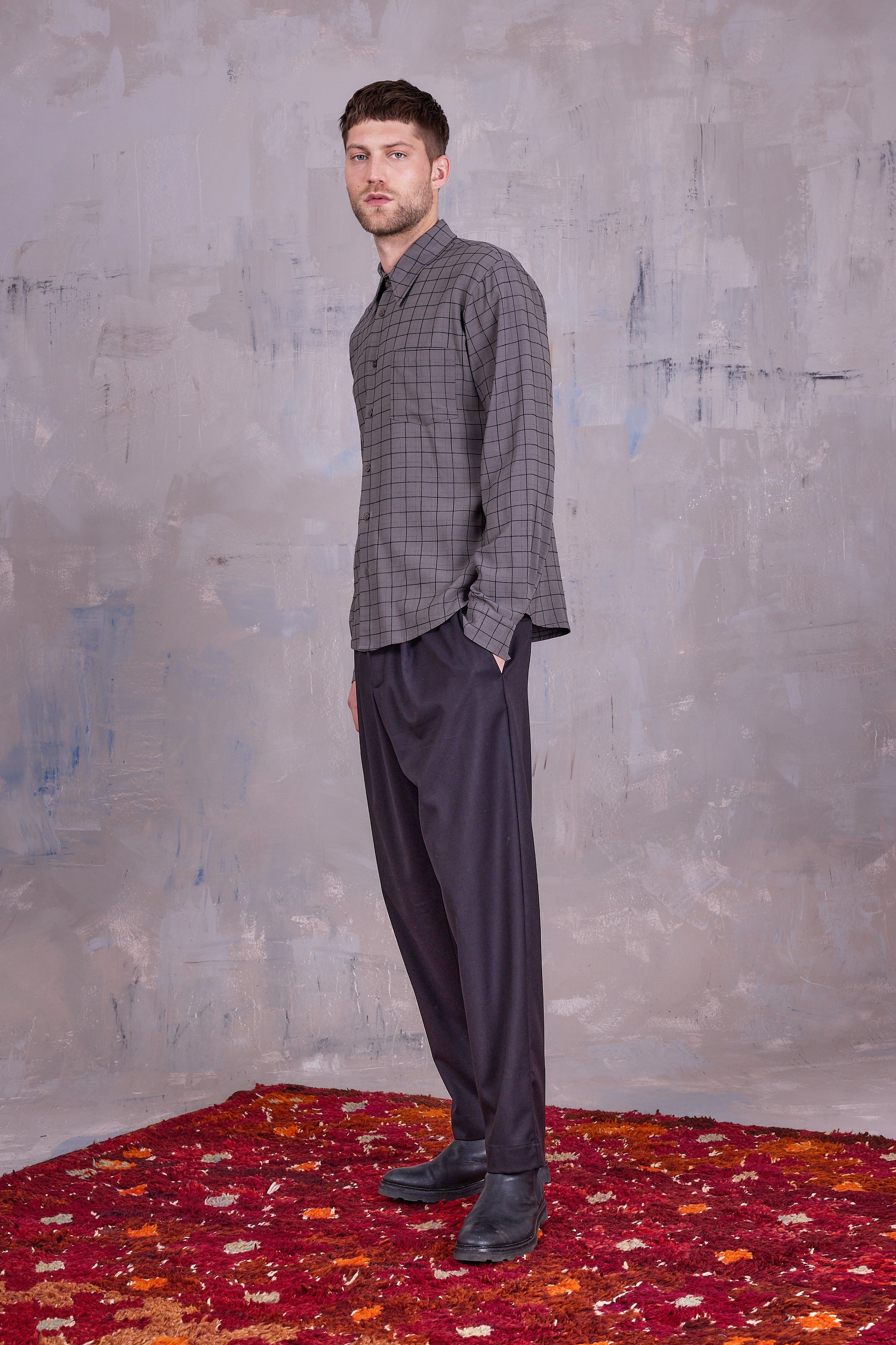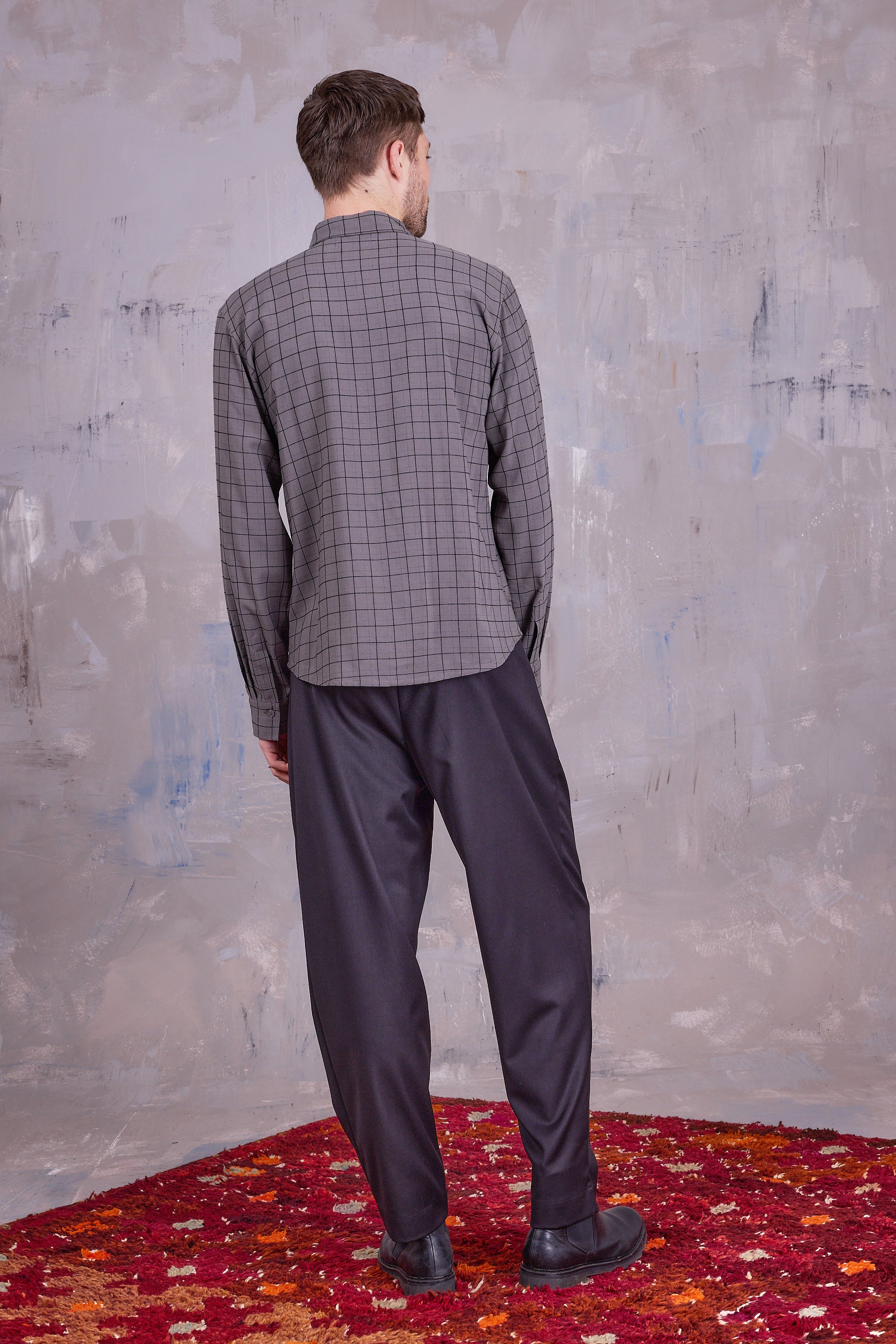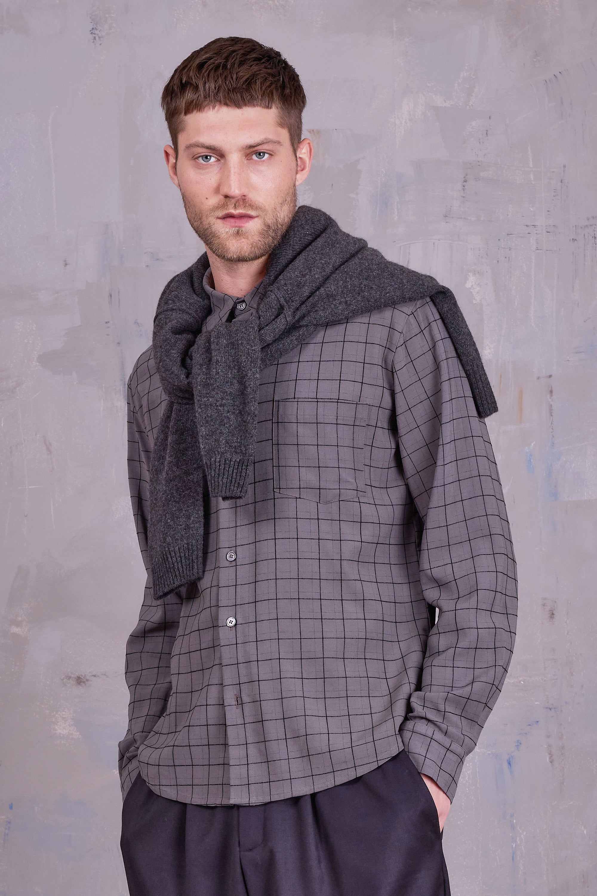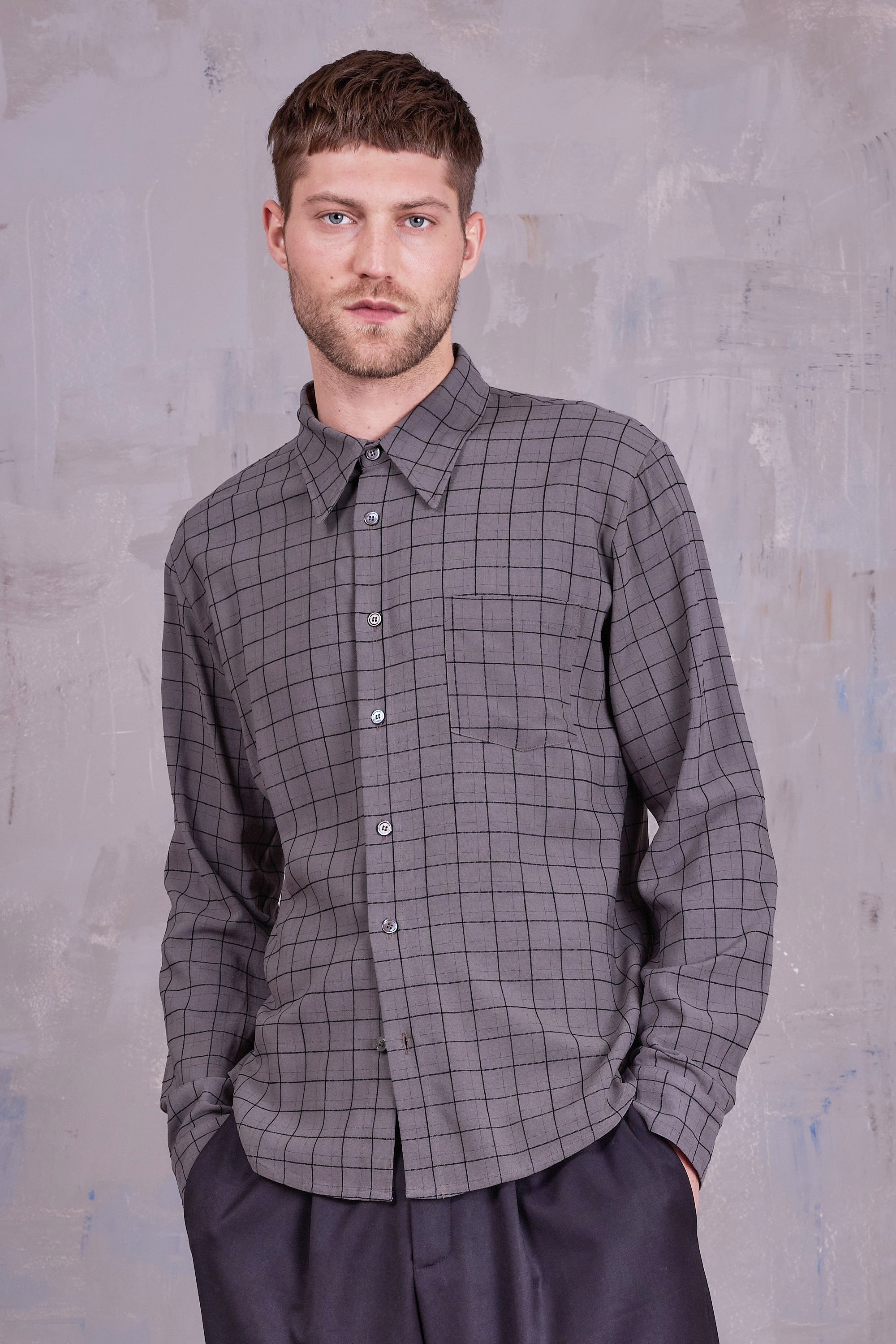 Klassisches Hemd aus grauer Viskose mit schwarzen Karos, die für Textur im Stoff sorgen.