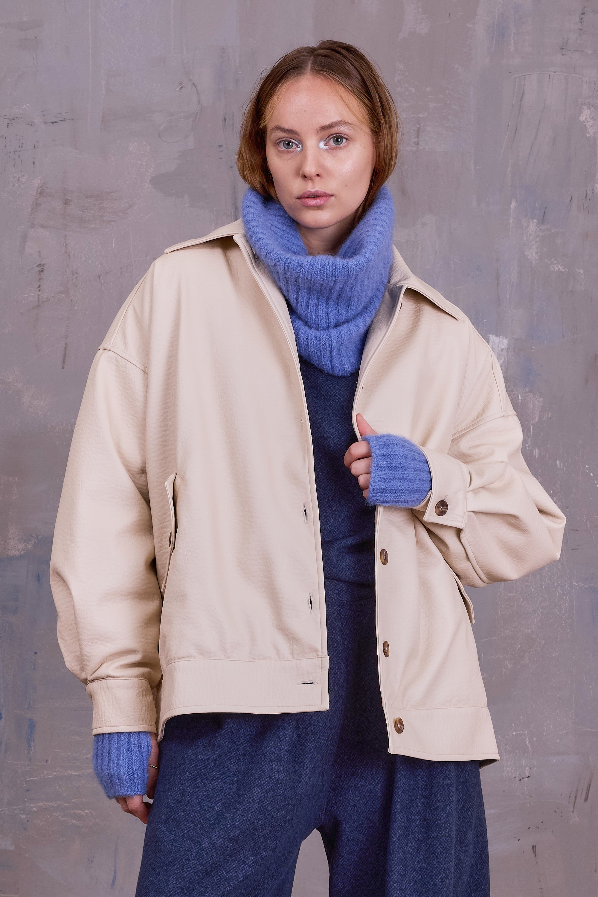 Übergroße Bomberjacke mit herabfallenden Schultern aus genarbtes Leder. Dieses tierfreundliche 'faux leather' ist wasserabweisend und hält somit einem herbstlichen Überraschungsregen stand. Das großzügige Volumen und die warme Wattierung innen machen es auch sehr angenehm zu tragen.