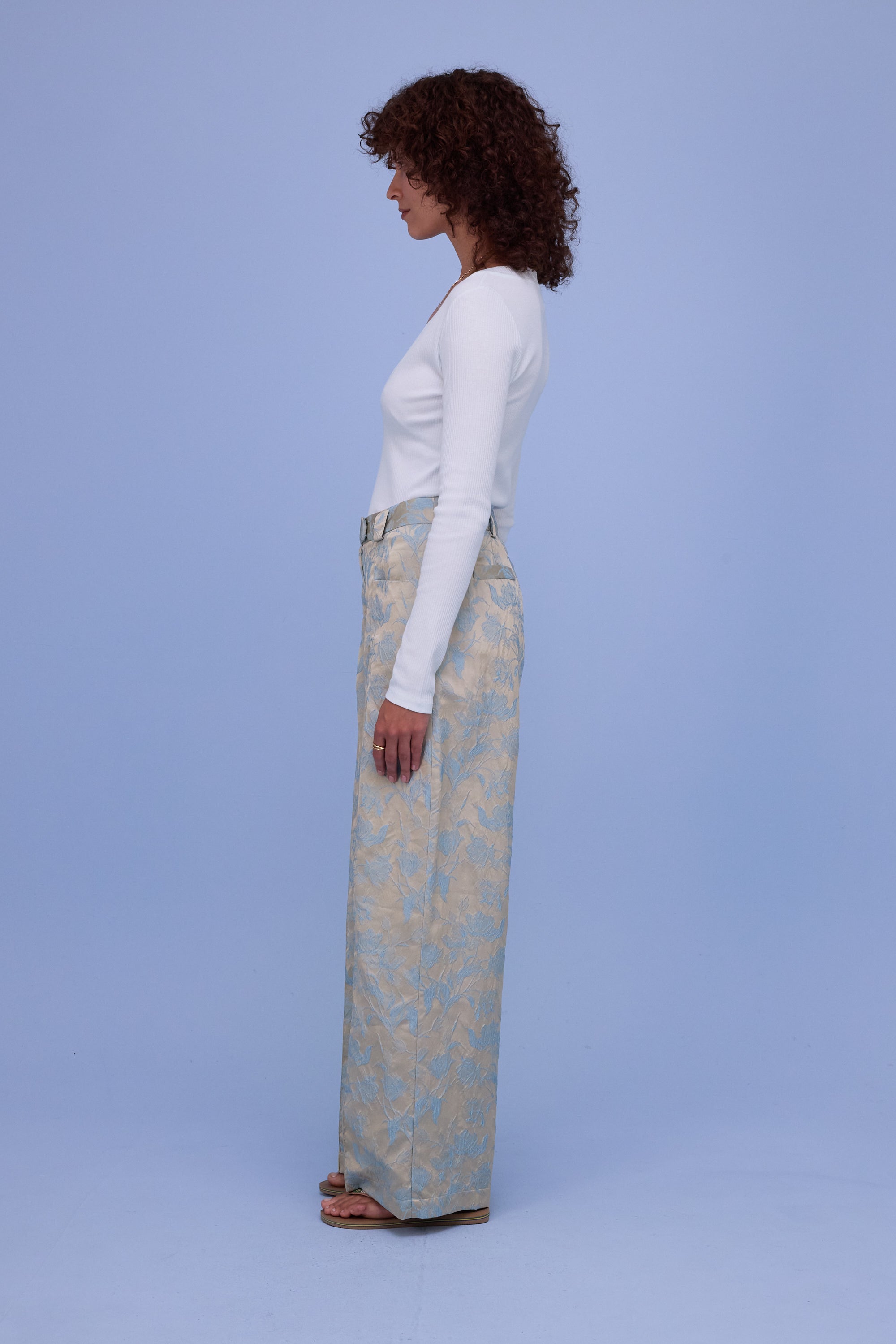 Hose aus fließendem Blumenjacquard. Bolivar ist seit Jahren ein Bestseller in der Kollektion, dank der eleganten hohen Taille und der geraden Beine mit Eingrifftaschen, die perfekt mit der vorderen Mittelnaht ausgerichtet sind und so die Silhouette optisch verlängern.