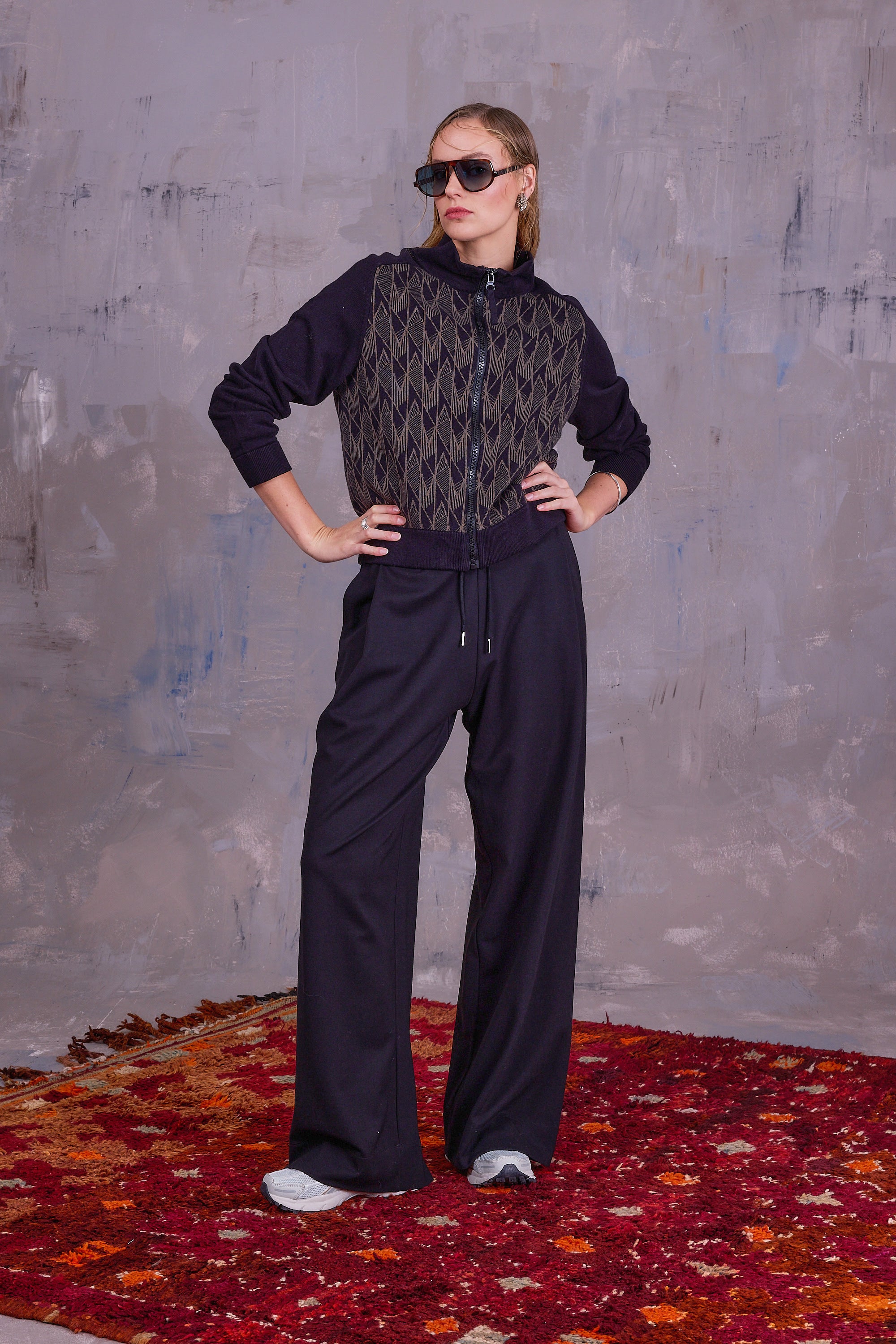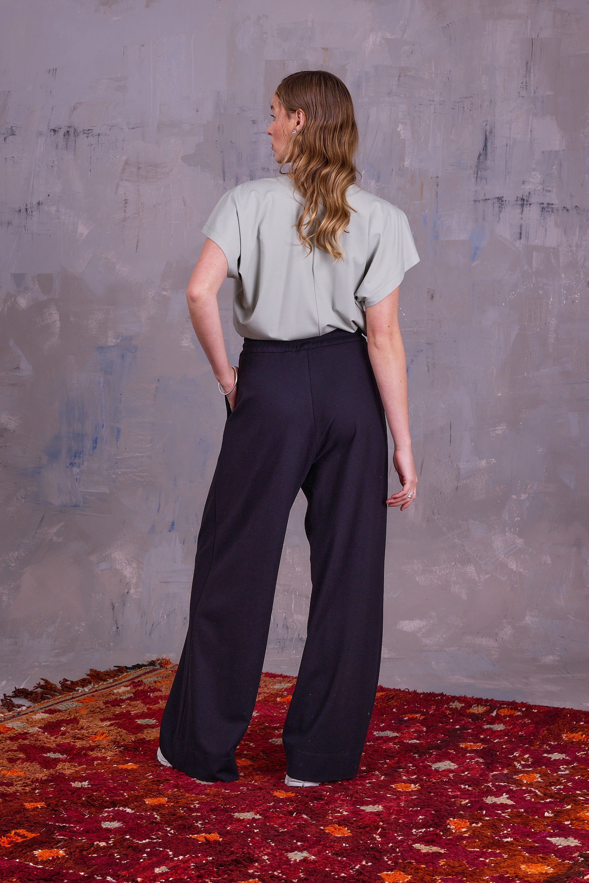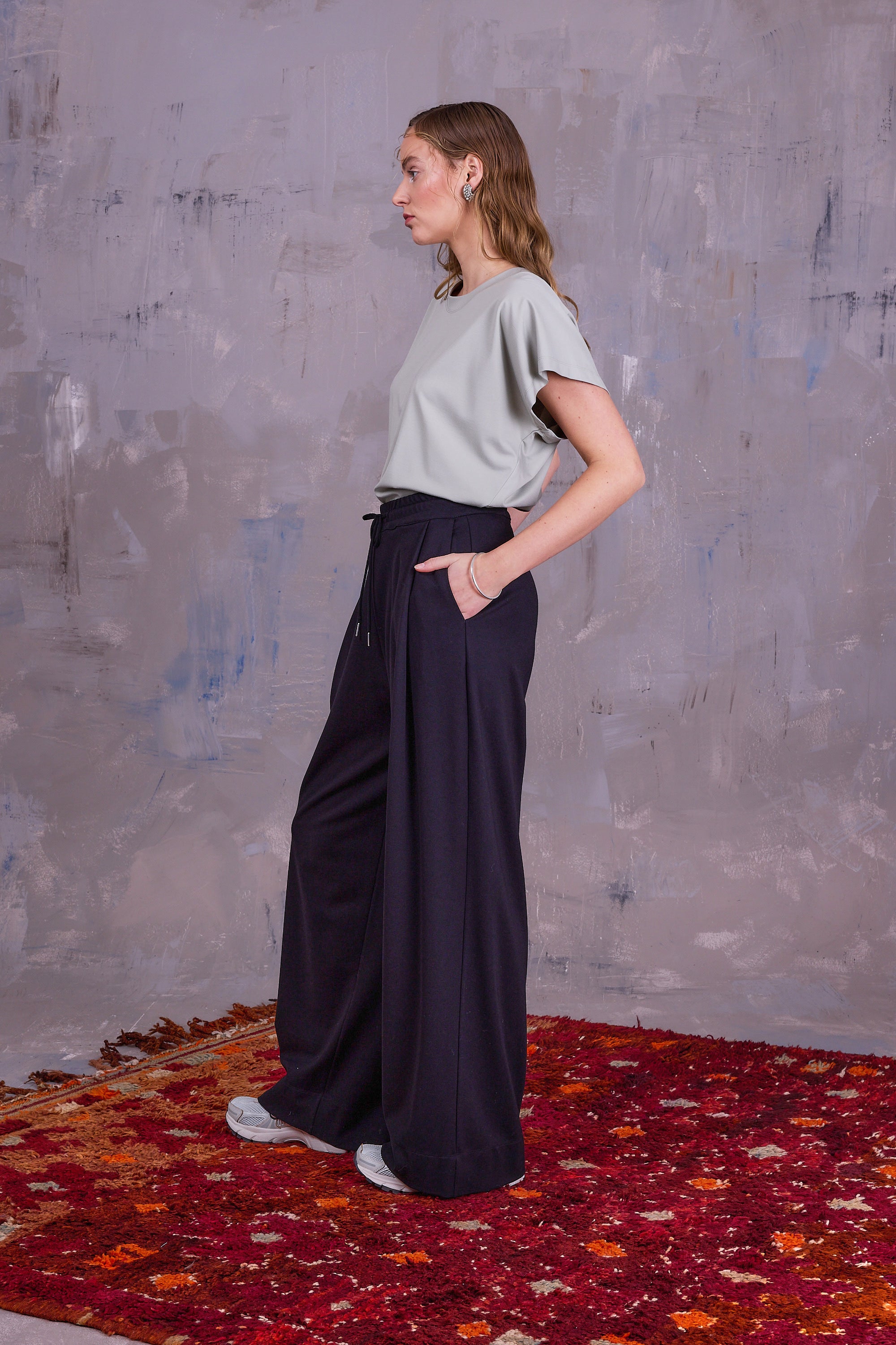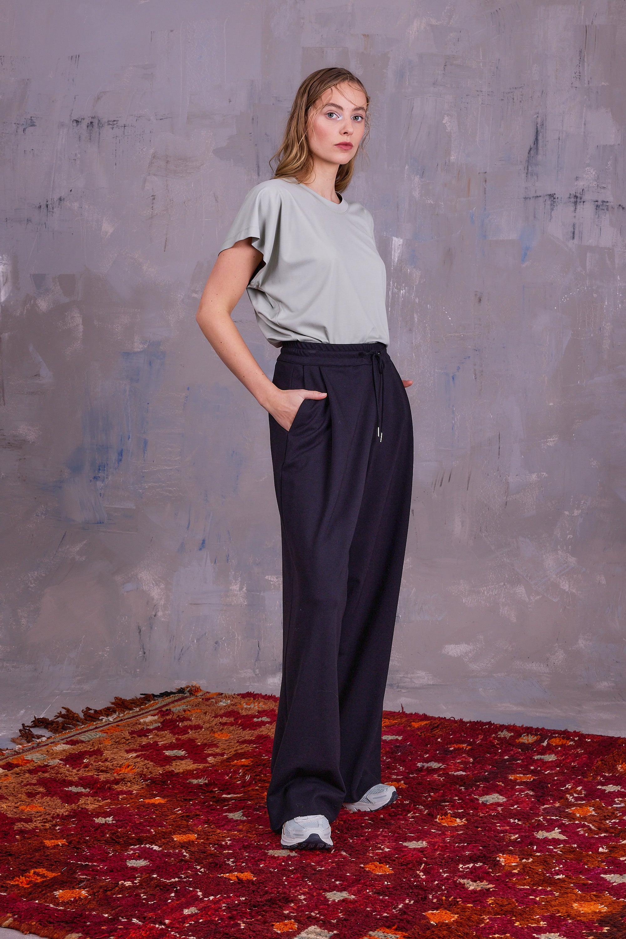 Wide trousers in heavy jersey with a wide elastic waistband, drawstring, and a subtle pleat. Go for a full look in combination with the Georgina or Gertruda sweater.