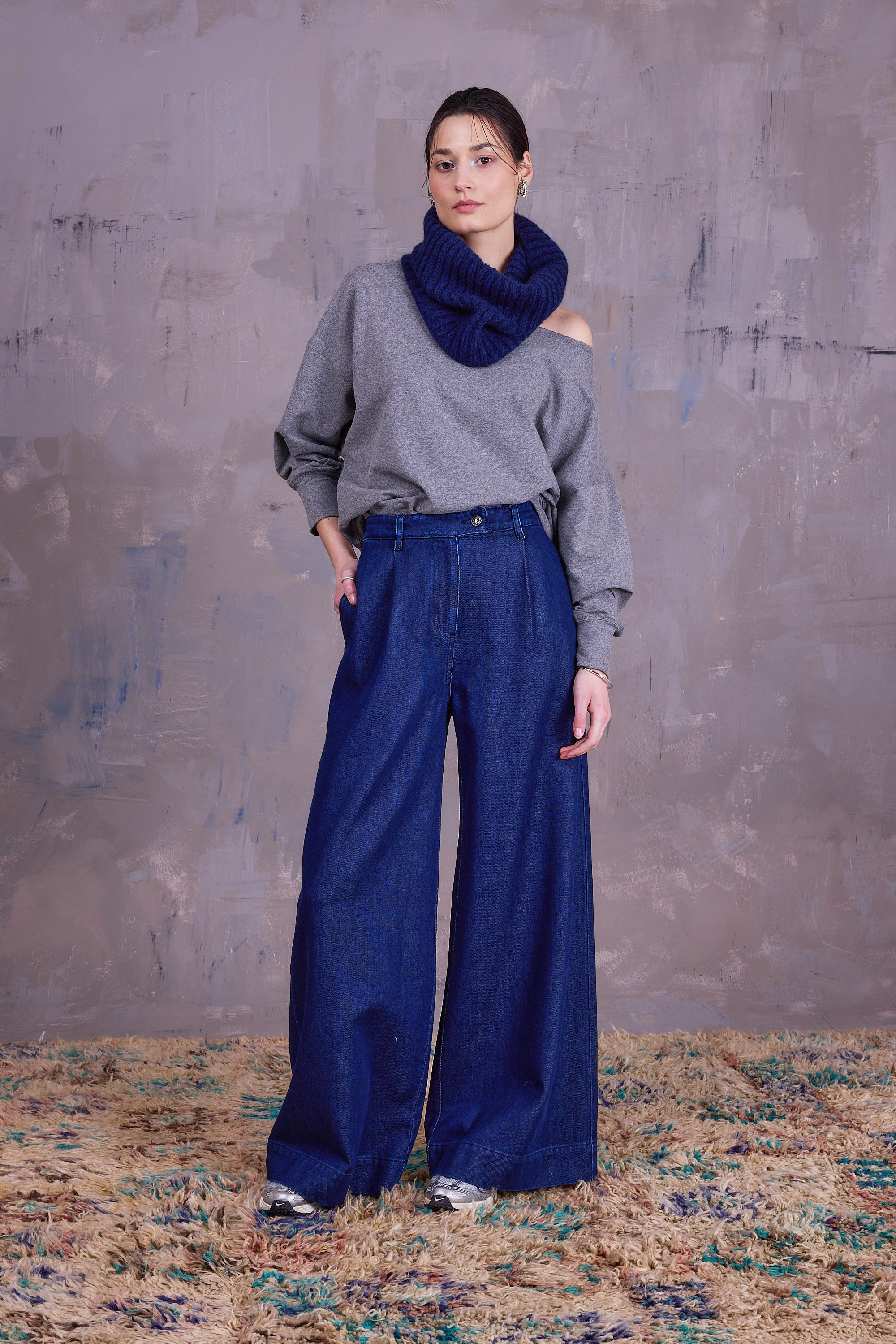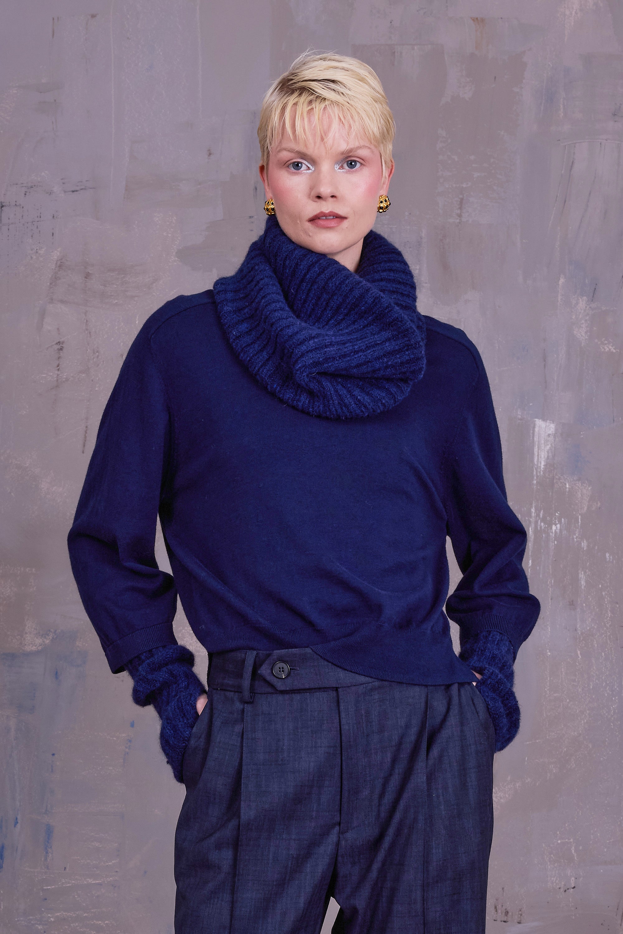 Ribbed loop scarf, knitted in Belgium in a fluffy yarn: a 100% natural mix of baby alpaca, cotton, and merino wool. Complete the set with the Gibson arm warmers.