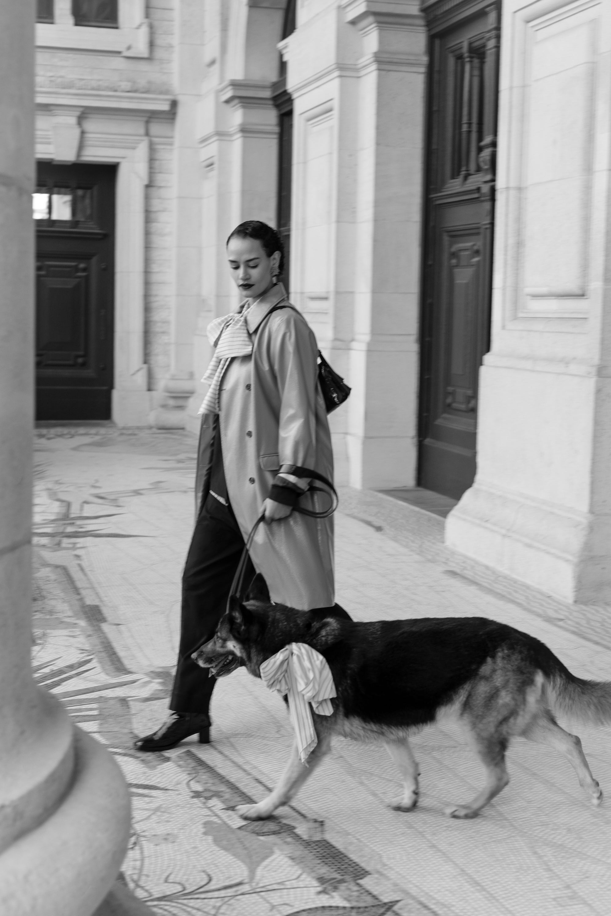 Nathalie Vleeschouwer designed two limited edition dog-sized scarves by request, made from leftover fabrics from the current Autumn-Winter '25 women's and men's collection. The collaboration didn't just happen; Nathalie Vleeschouwer has a big heart for animals and even has two Dachshunds as office dogs at their Antwerp headquarters.