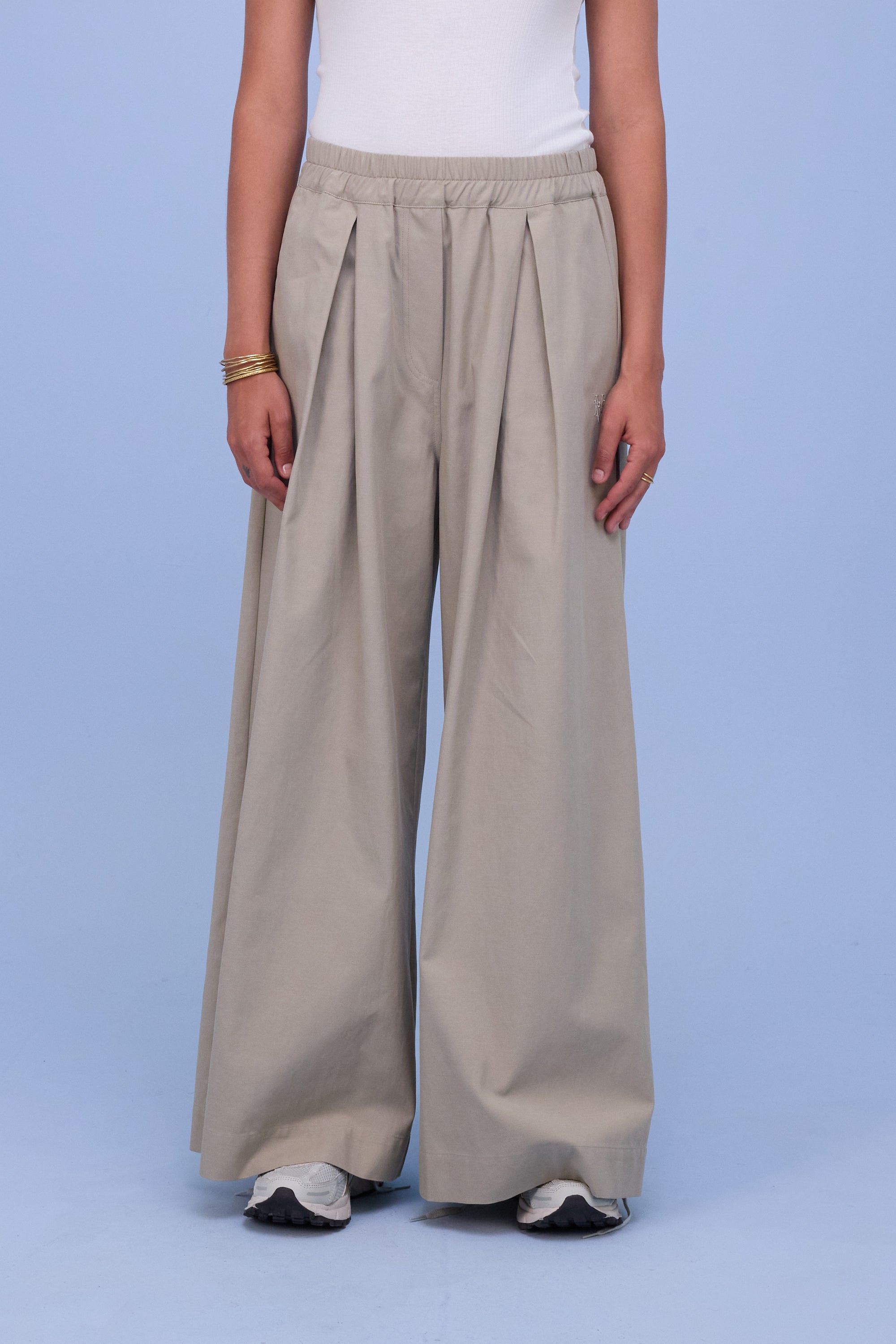 Narrow waist with elastic band featuring gathering and pleats, side pockets, wide volume in the legs.