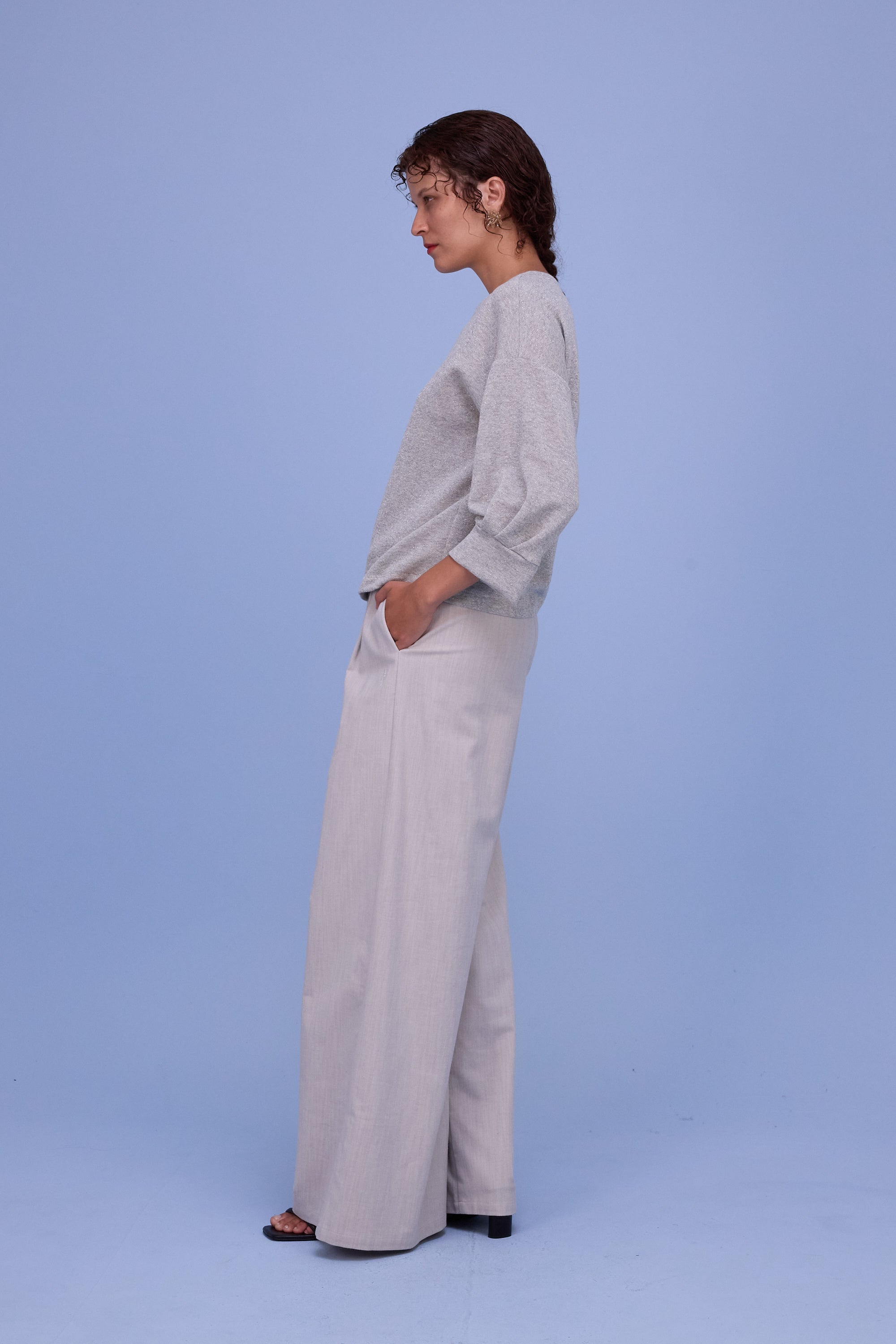 A long-time favourite. Sweater with elegant three-quarter sleeves featuring pleat details for extra volume. Version in mottled, brushed cotton with a subtle lurex thread woven through. So comfy and beautiful, you'll want to live in it right away.
