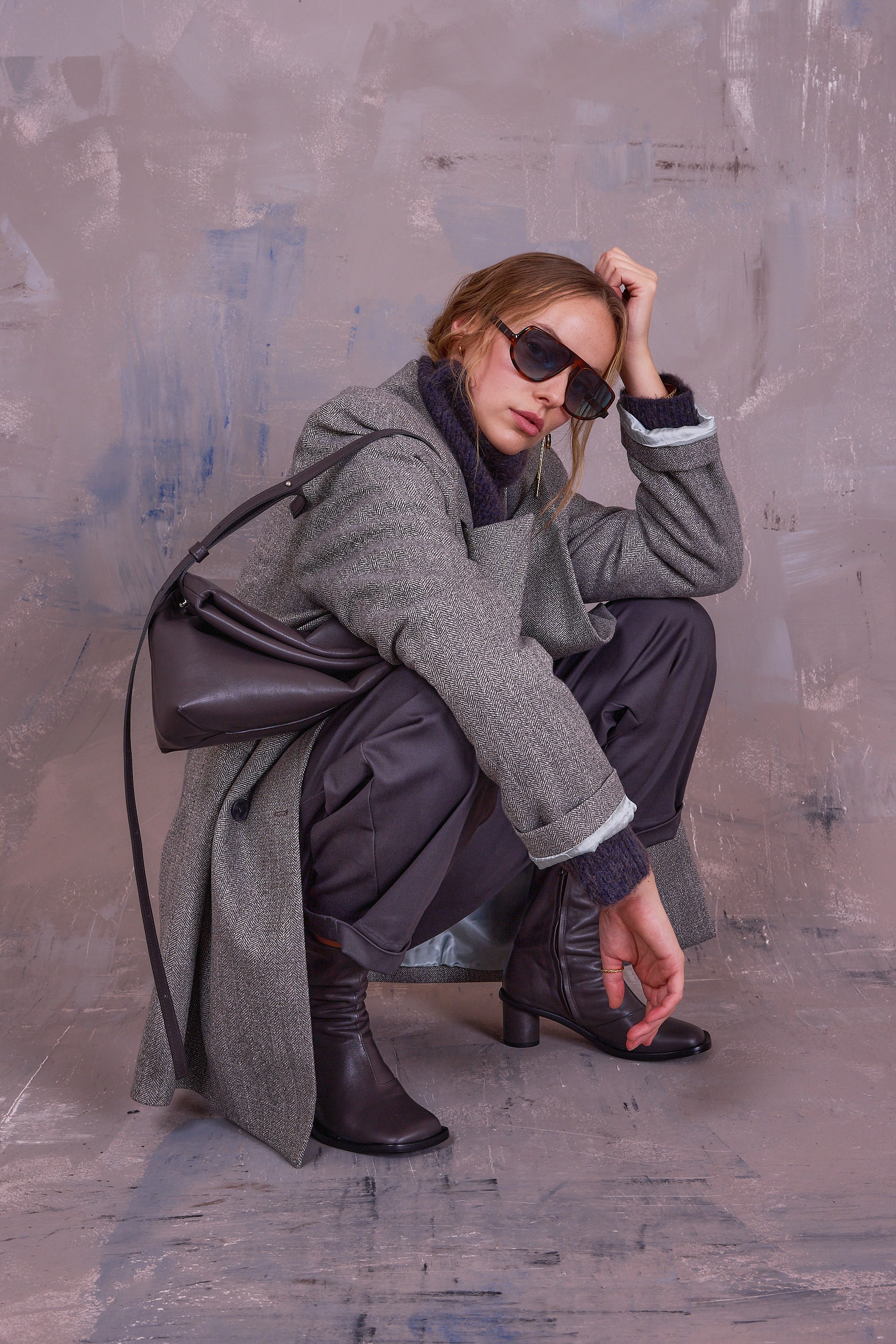 Formal double breasted long blazer in a melange fabric with a herringbone structure, a piece that cannot be missed in the 'preppy cool' story of the AW25 collection. Can be used as a mid-season jacket, but light enough to wear indoors in colder months.