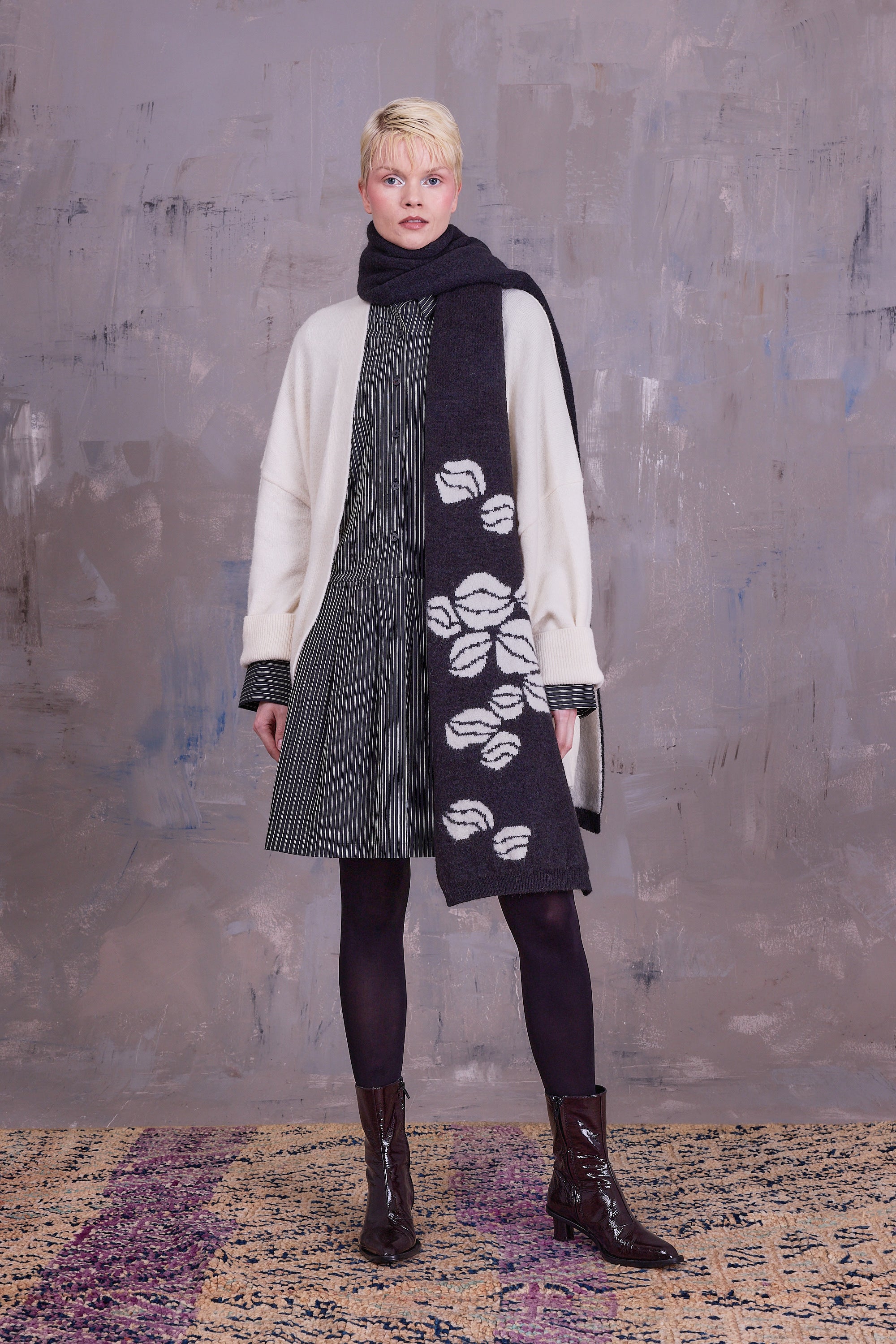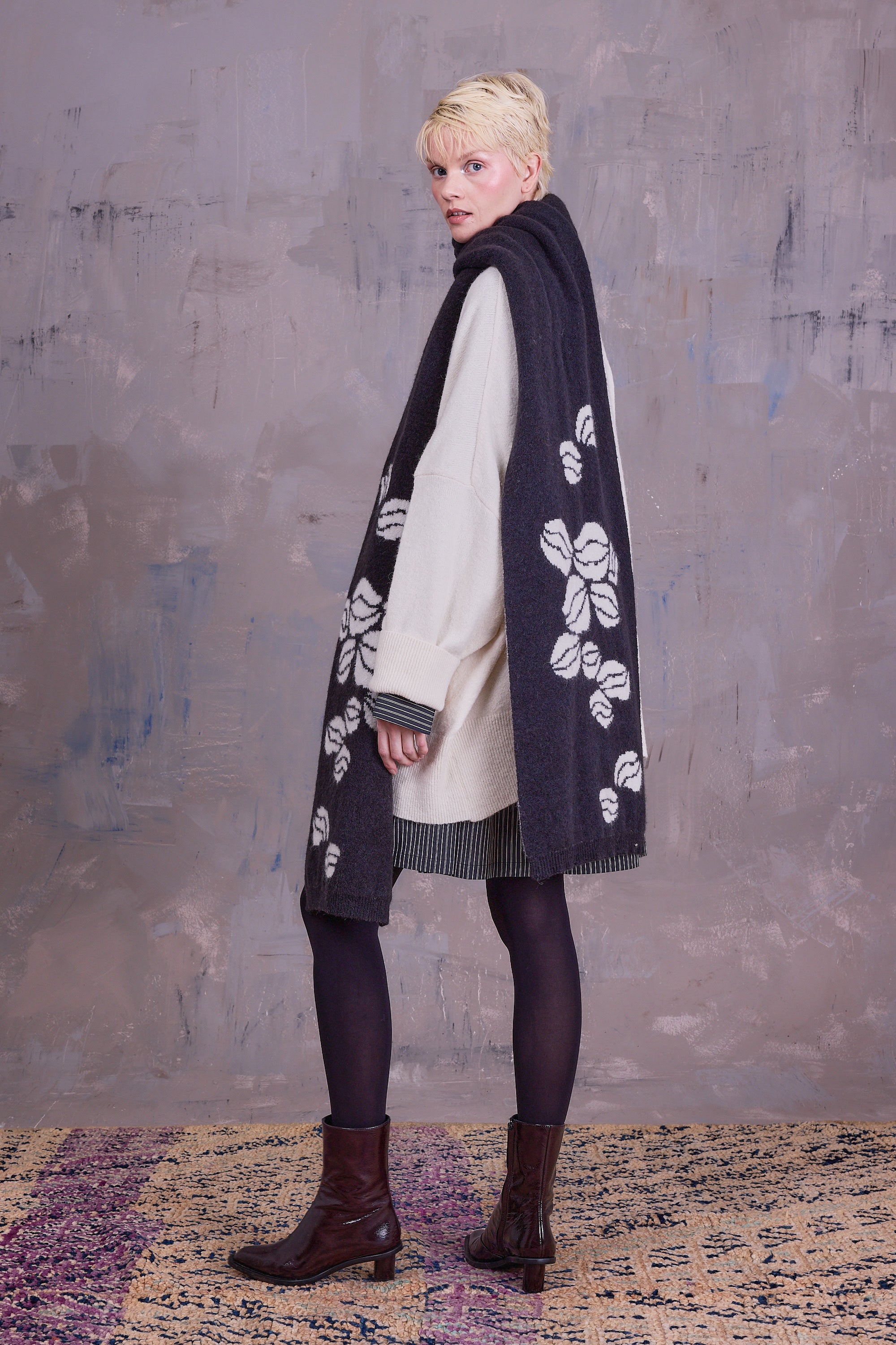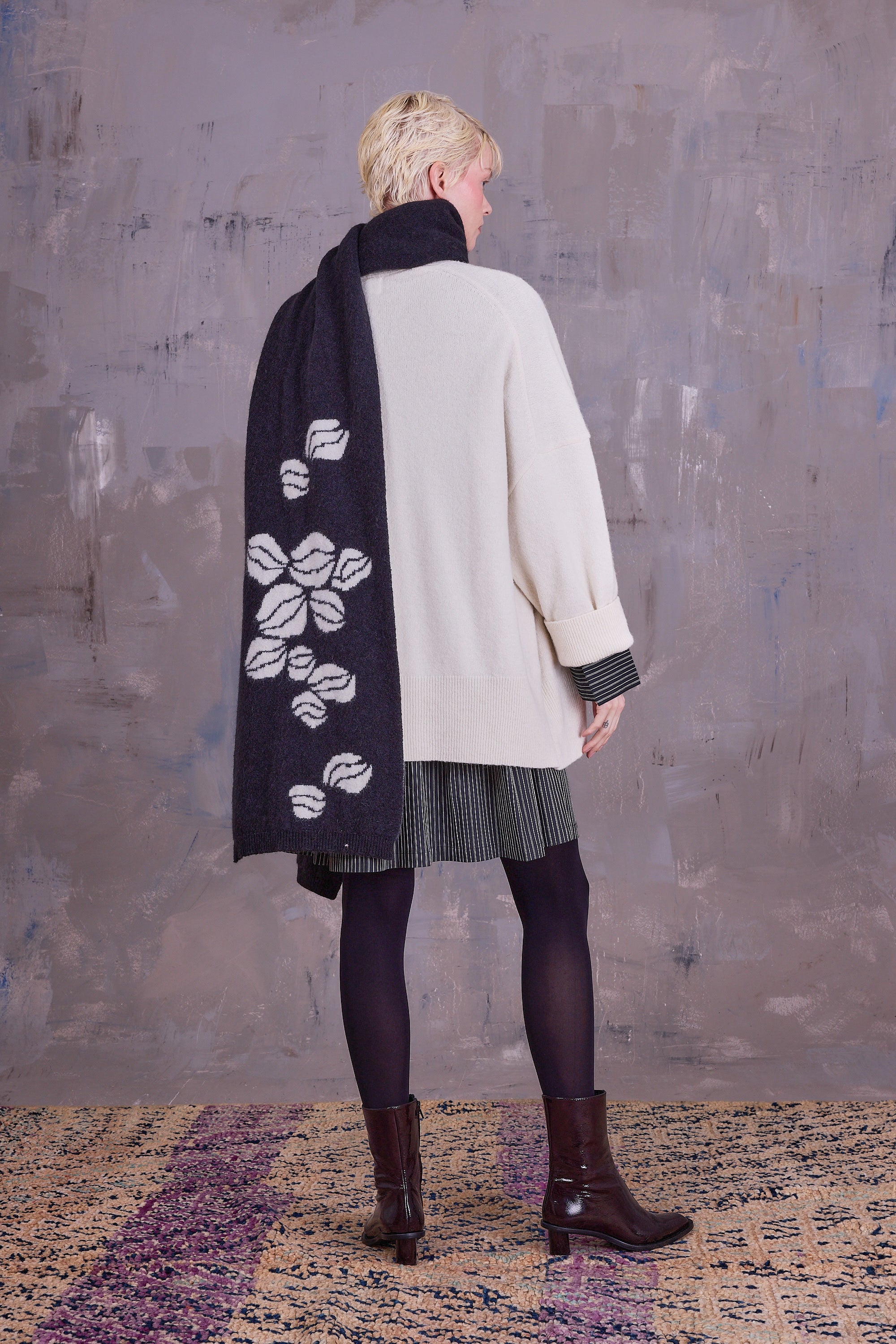 L’écharpe est double face : d’un côté, elle a une base noire avec un motif écru, de l’autre côté, elle a une base écrue avec un motif noir.