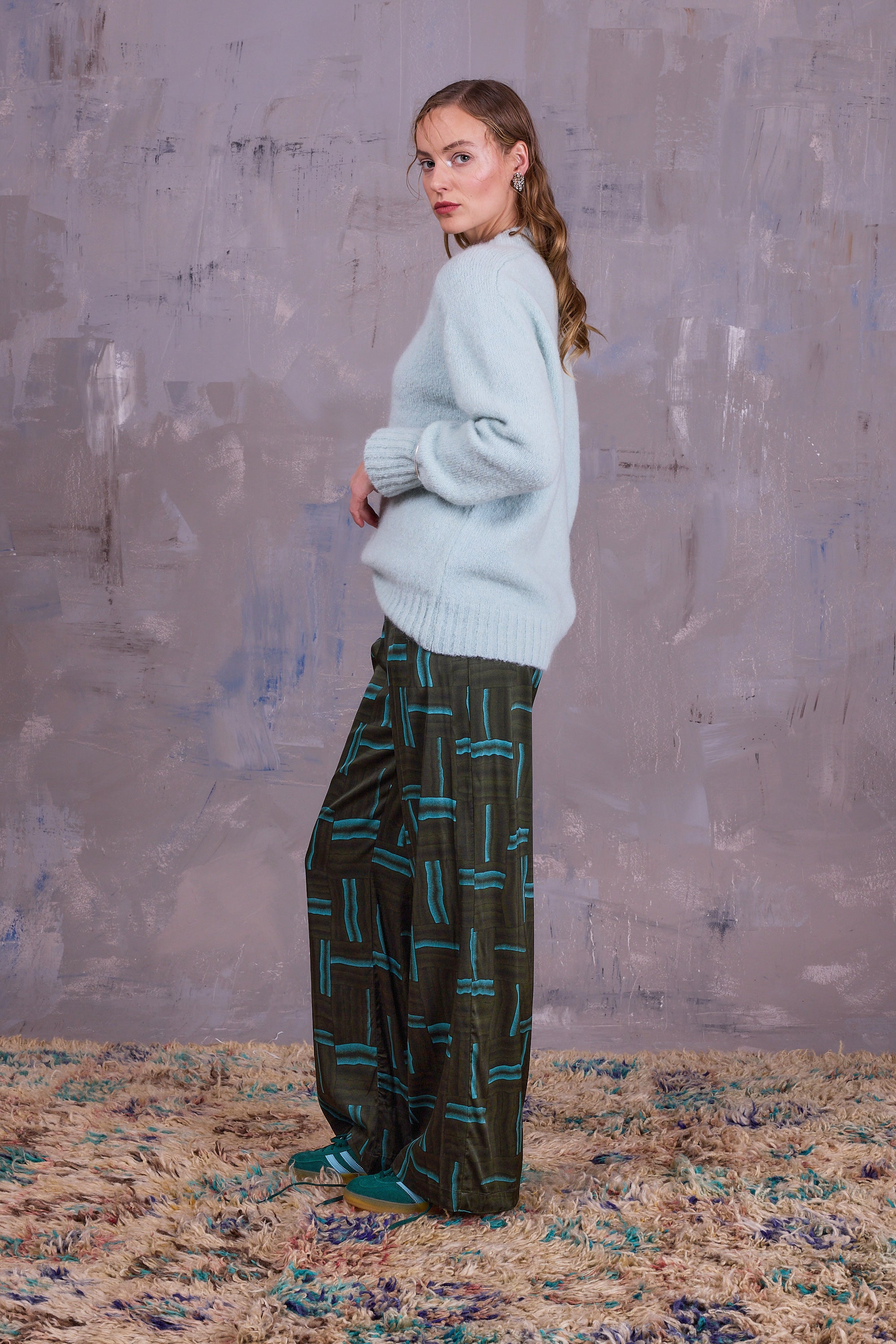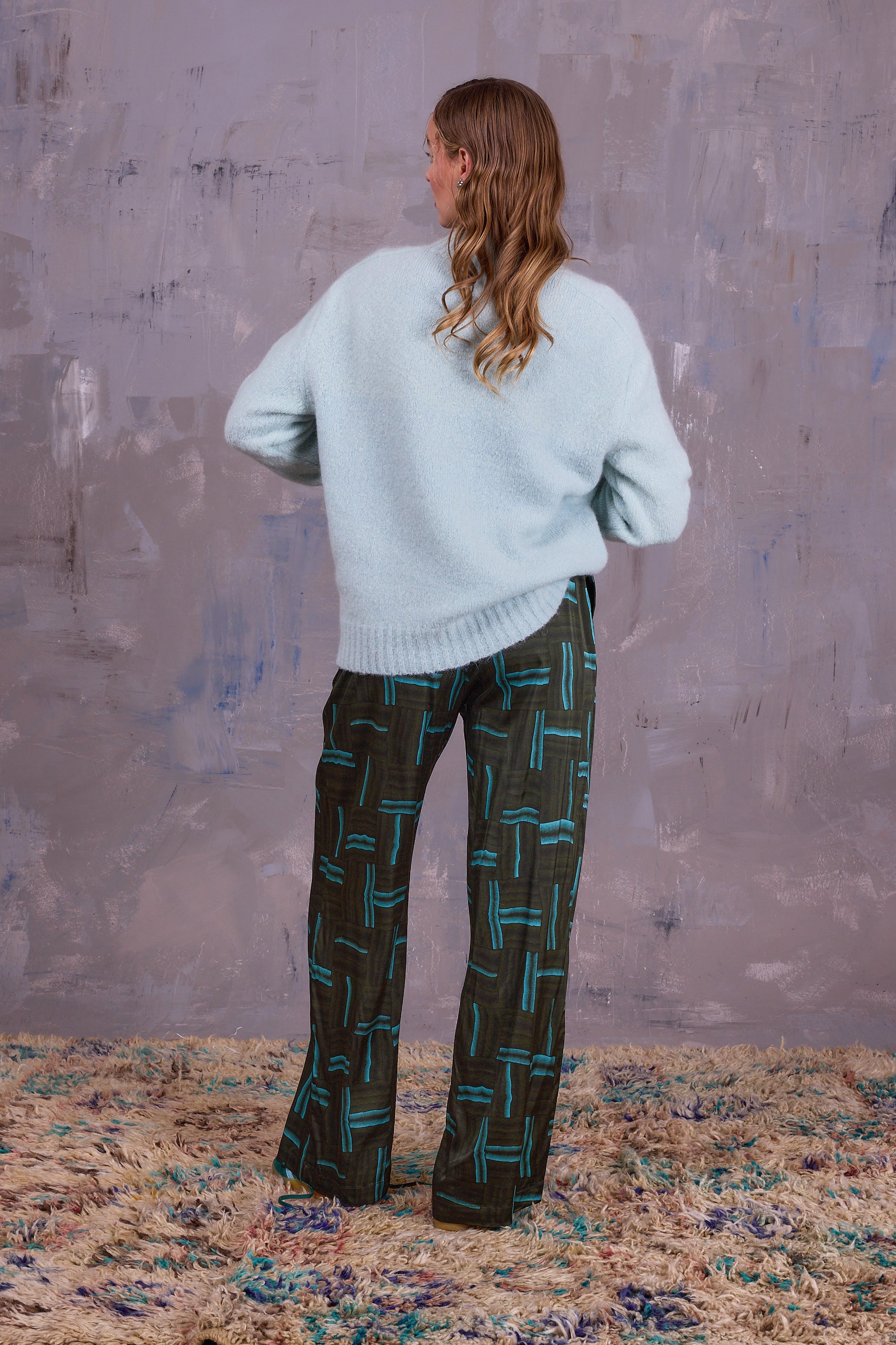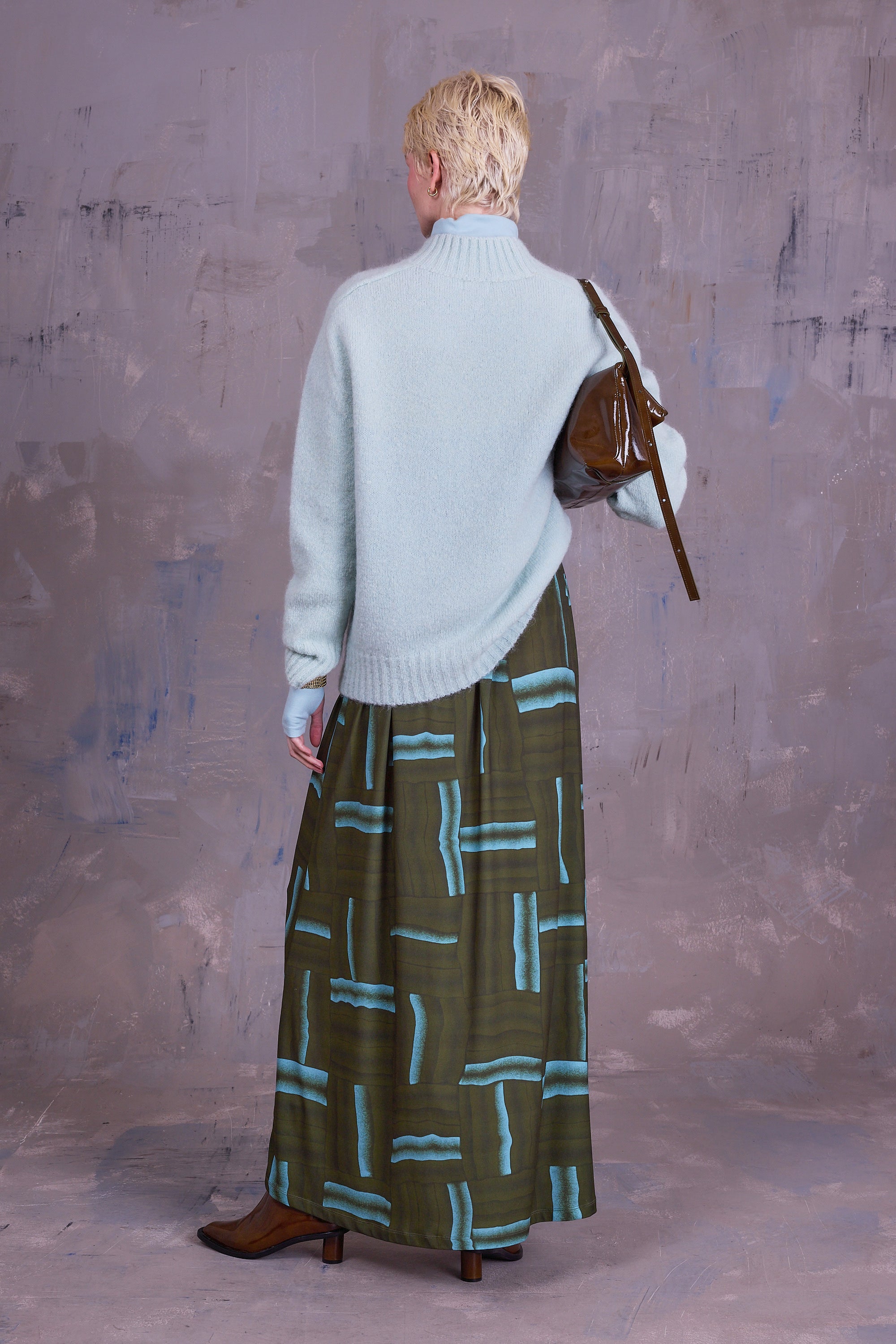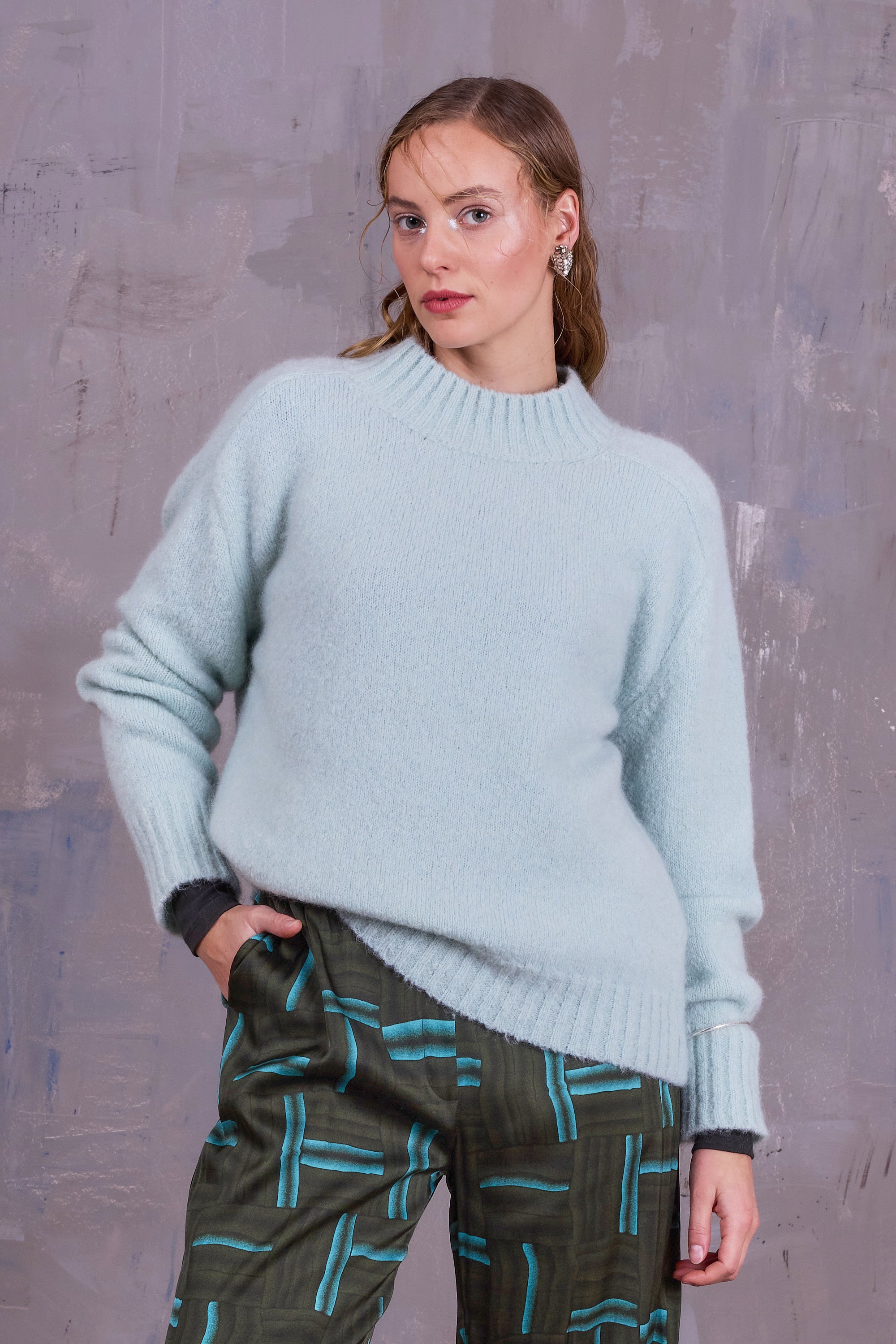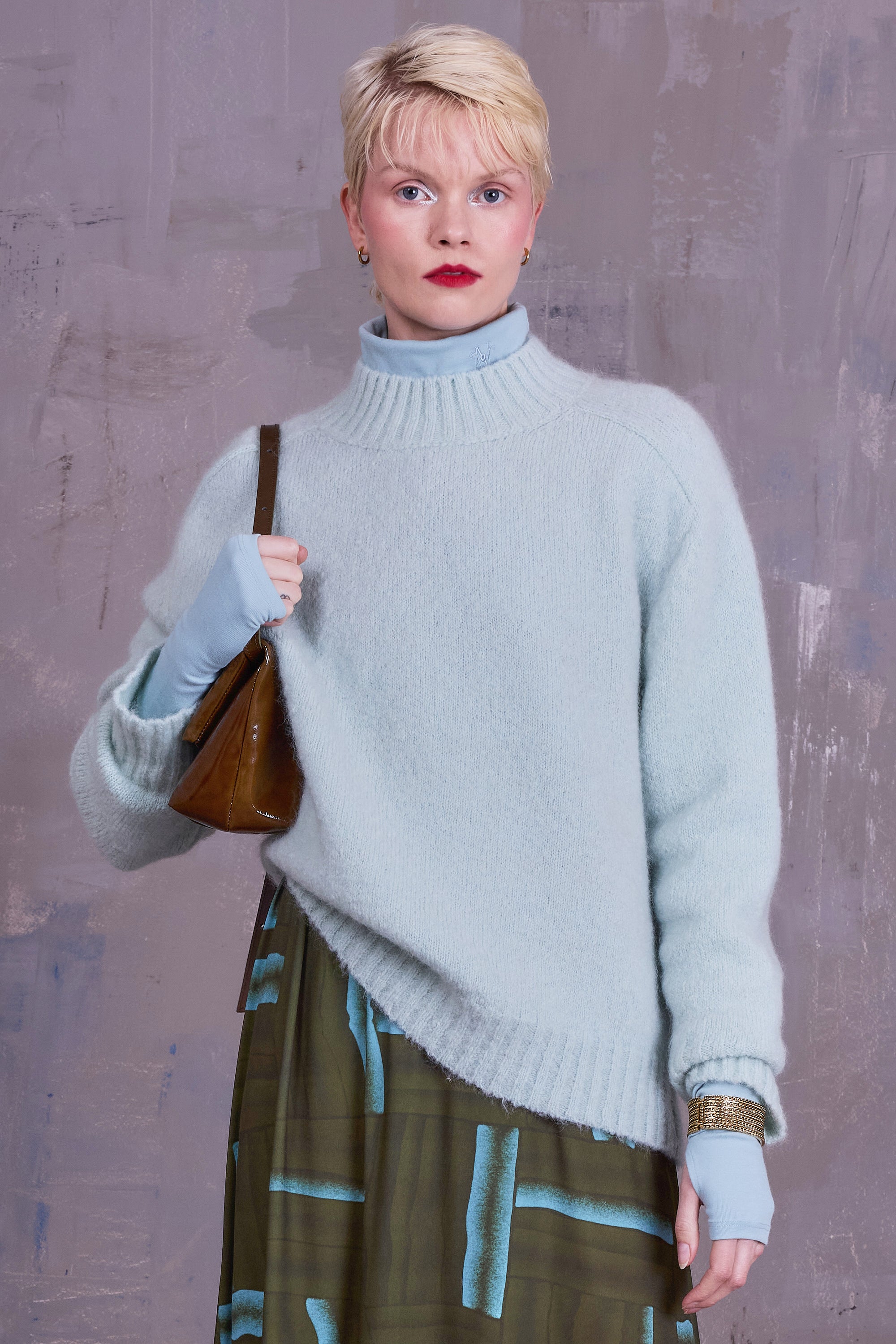 Pull oversize à col montant et manches marteau dans un mélange chaud et agréable de mohair et de laine mérinos, tricoté en Belgique. Le col montant est assez bas pour pouvoir porter une chemise en dessous, parfait pour un look en couches.