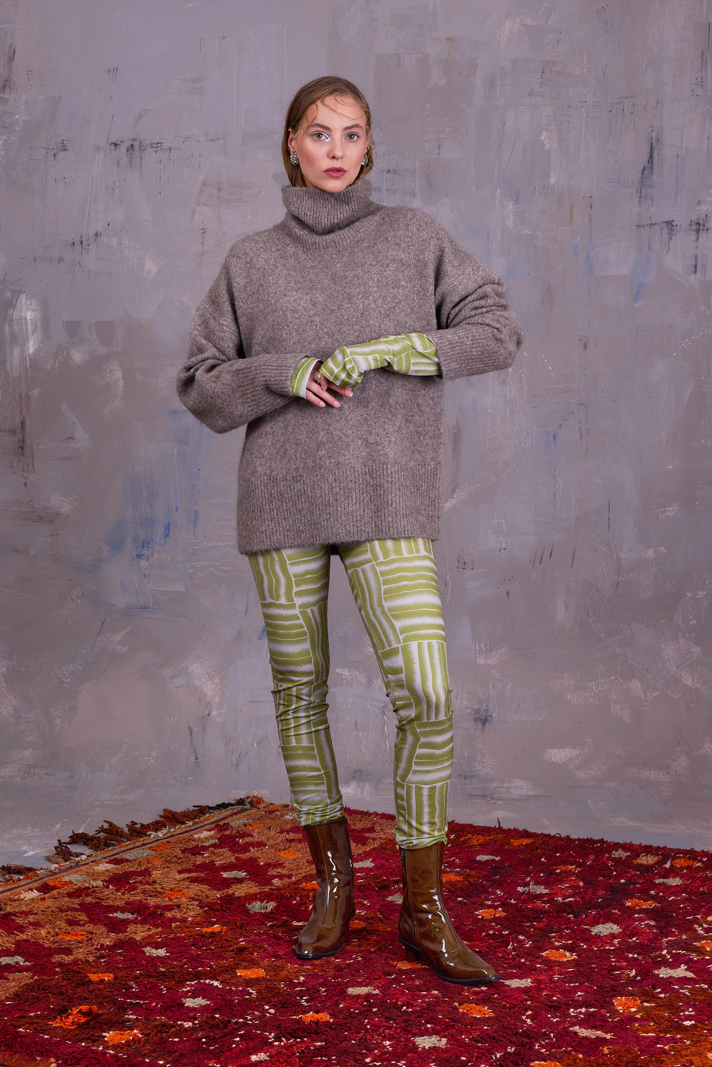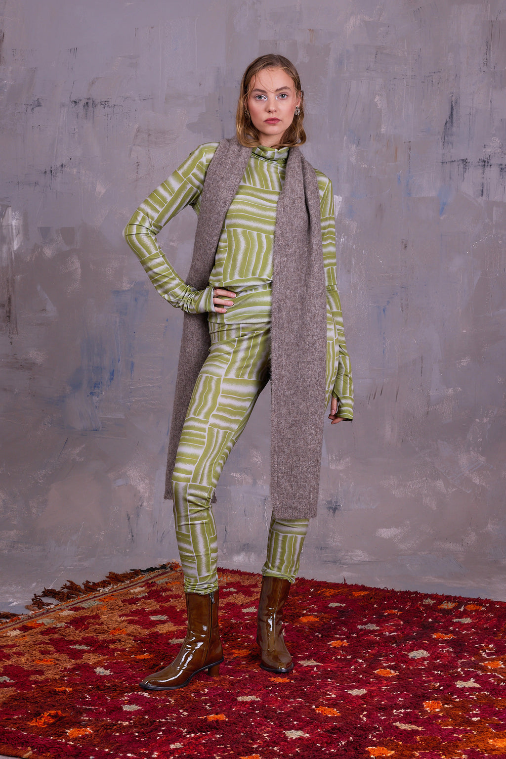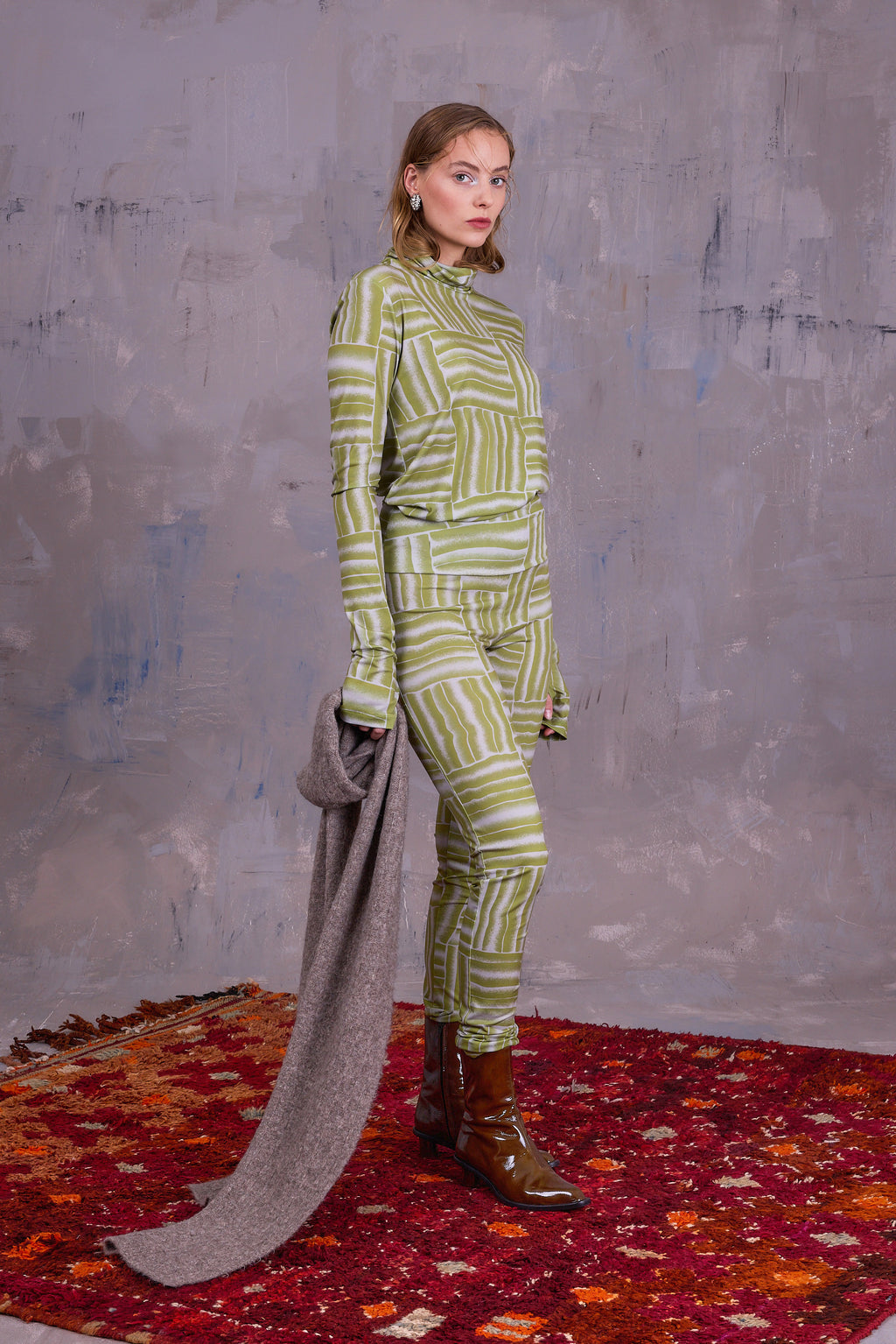 Col roulé ajusté en tissu stretch avec un imprimé conçu dans notre propre atelier. Juste un peu différent parce que les manchons s’allongent optiquement en raison des trous pour les pouces qui maintiennent les manchons à mi-hauteur de votre main. Pièce idéale pour une tenue superposée.