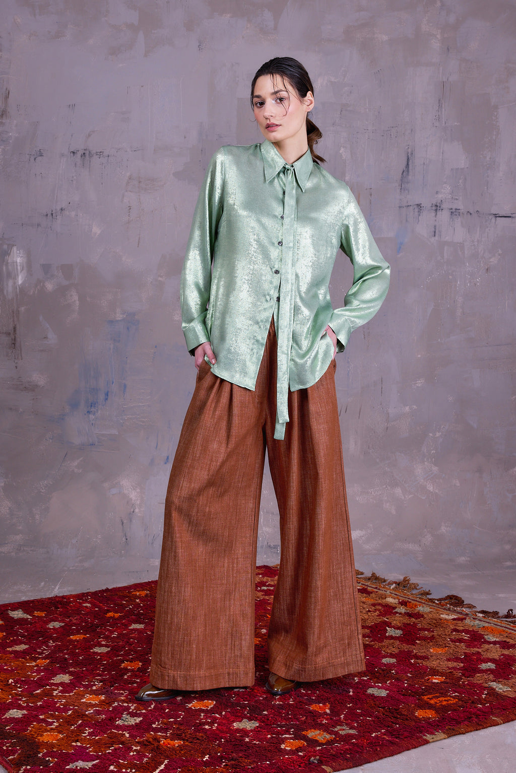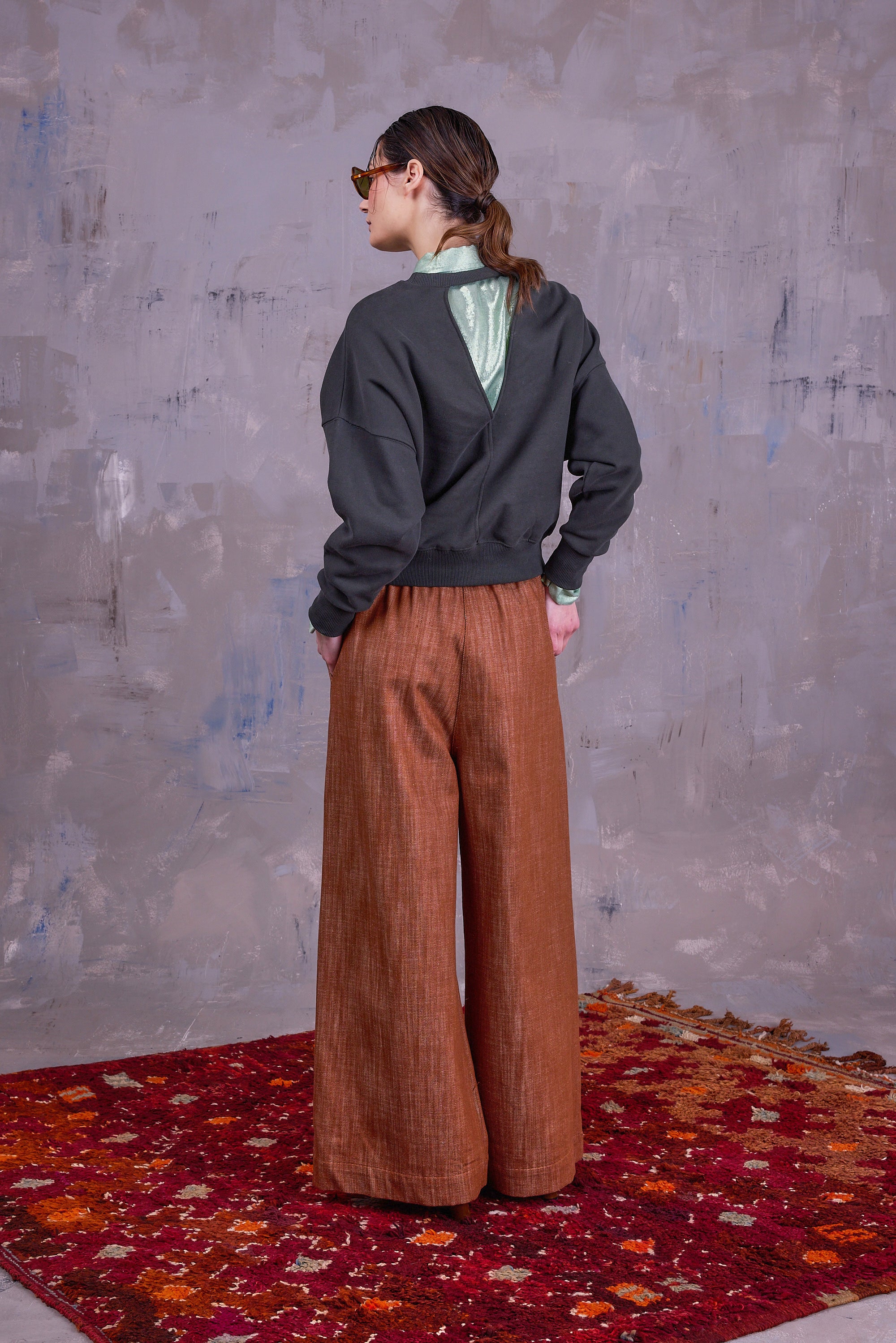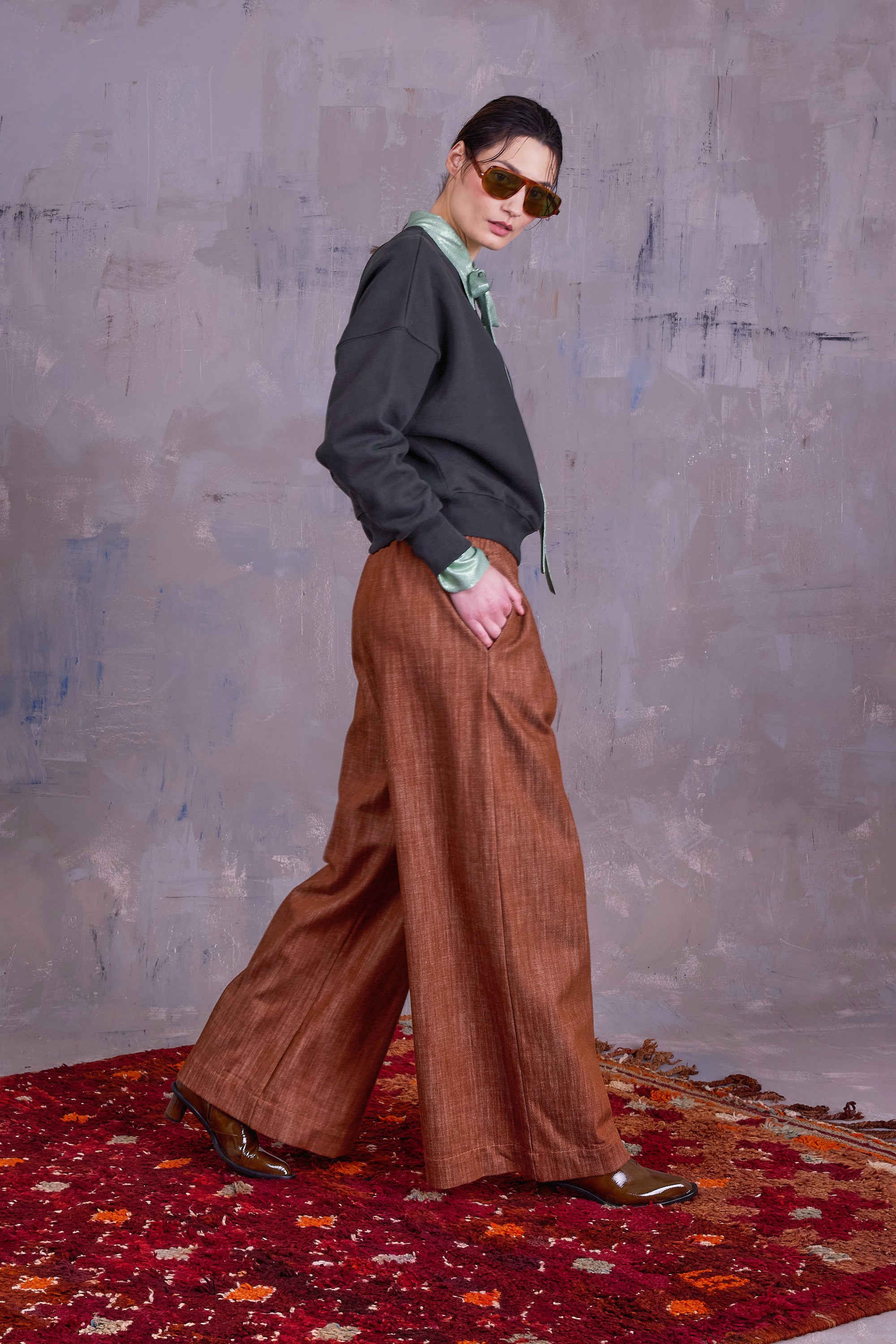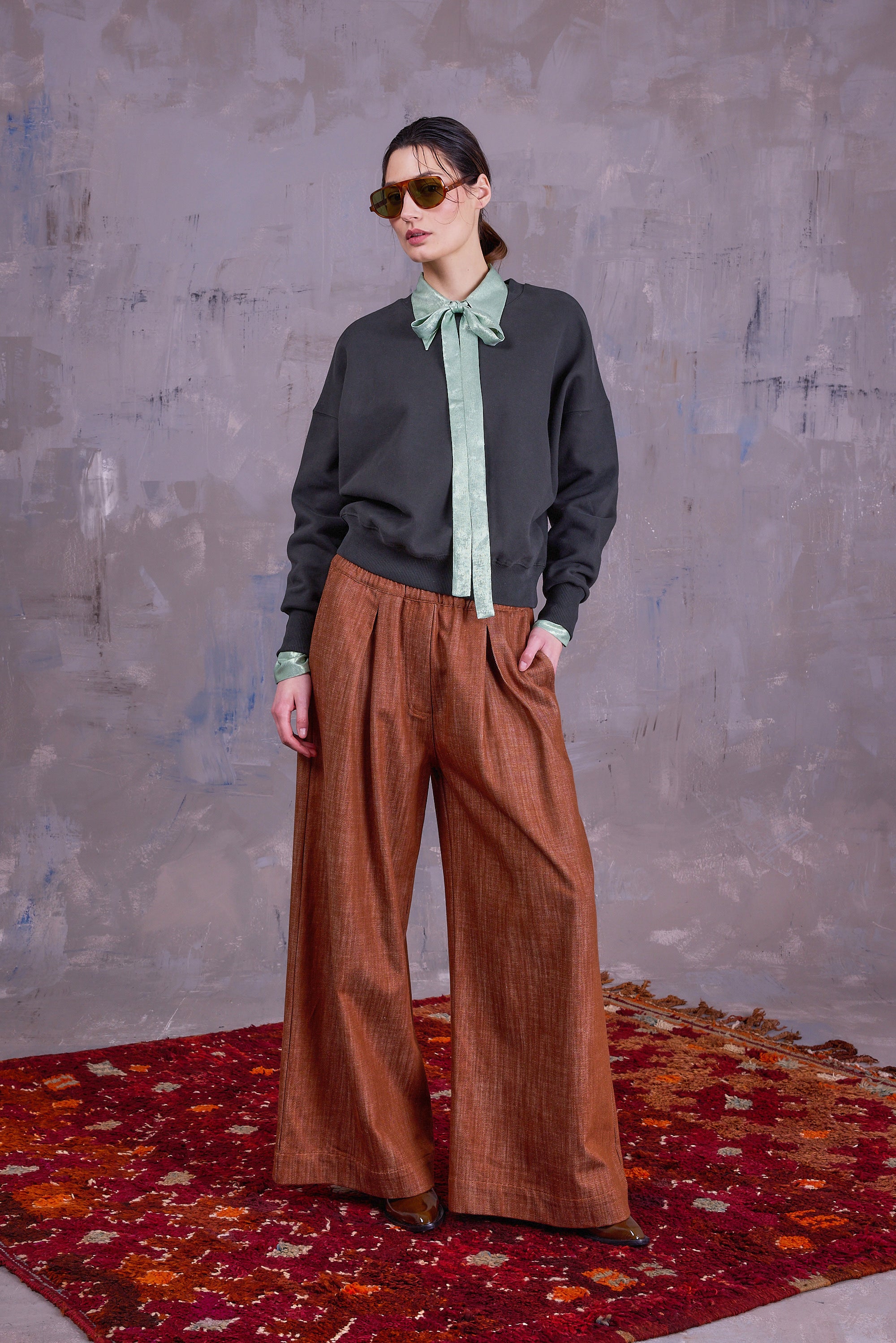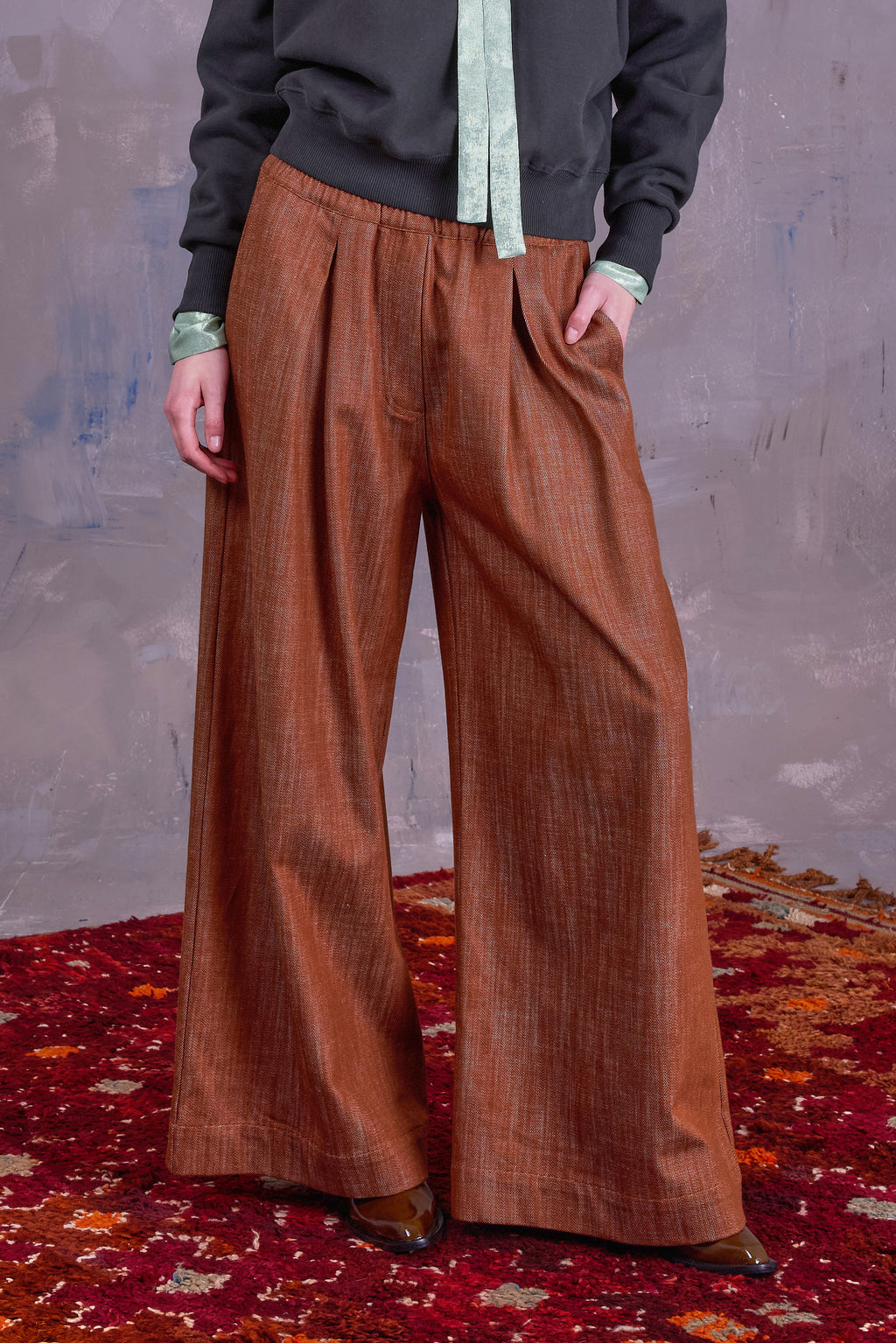 Pantalon volumineux avec plis et large ceinture élastique. Épuisé en un rien de temps la saison dernière et réintroduit cette saison dans de nouveaux tissus et couleurs.