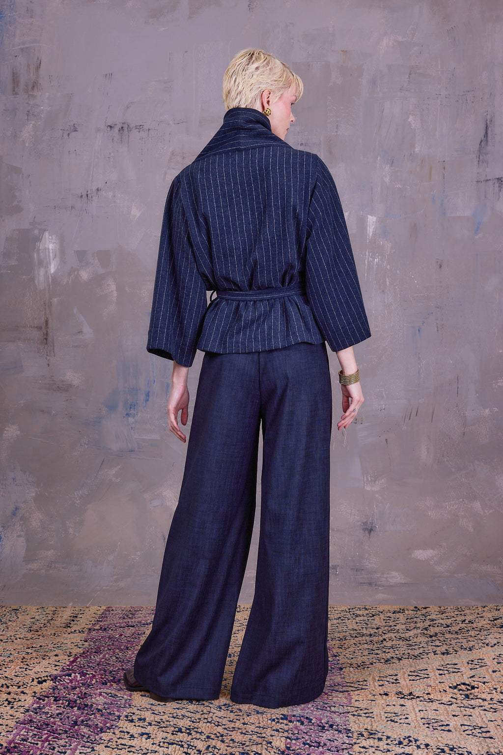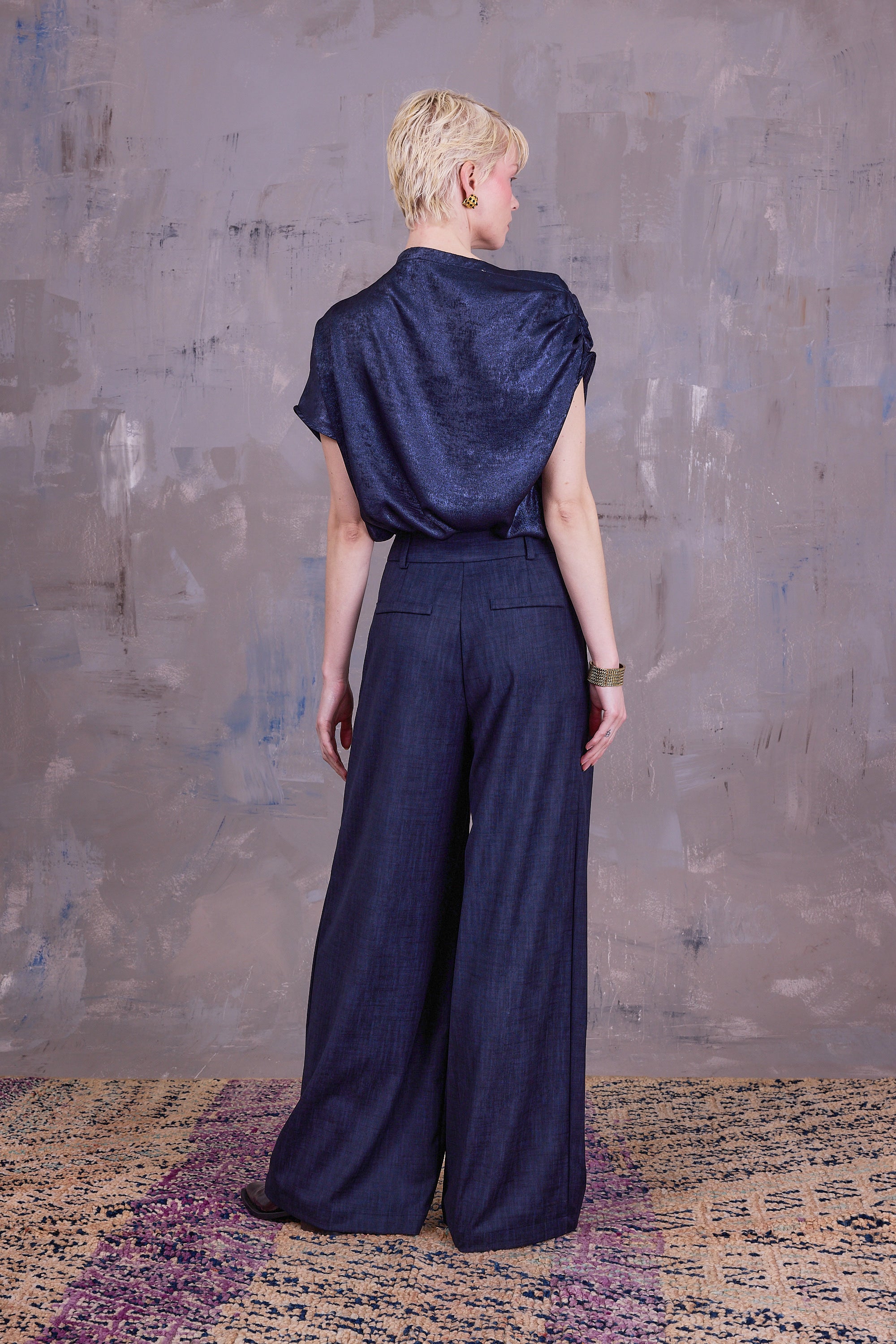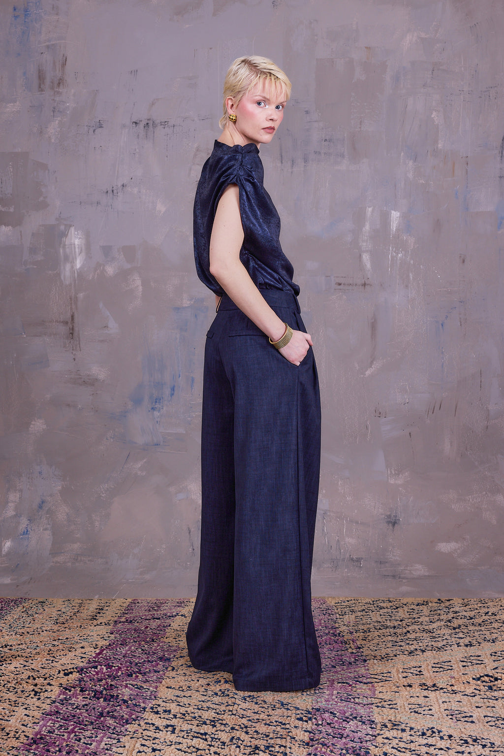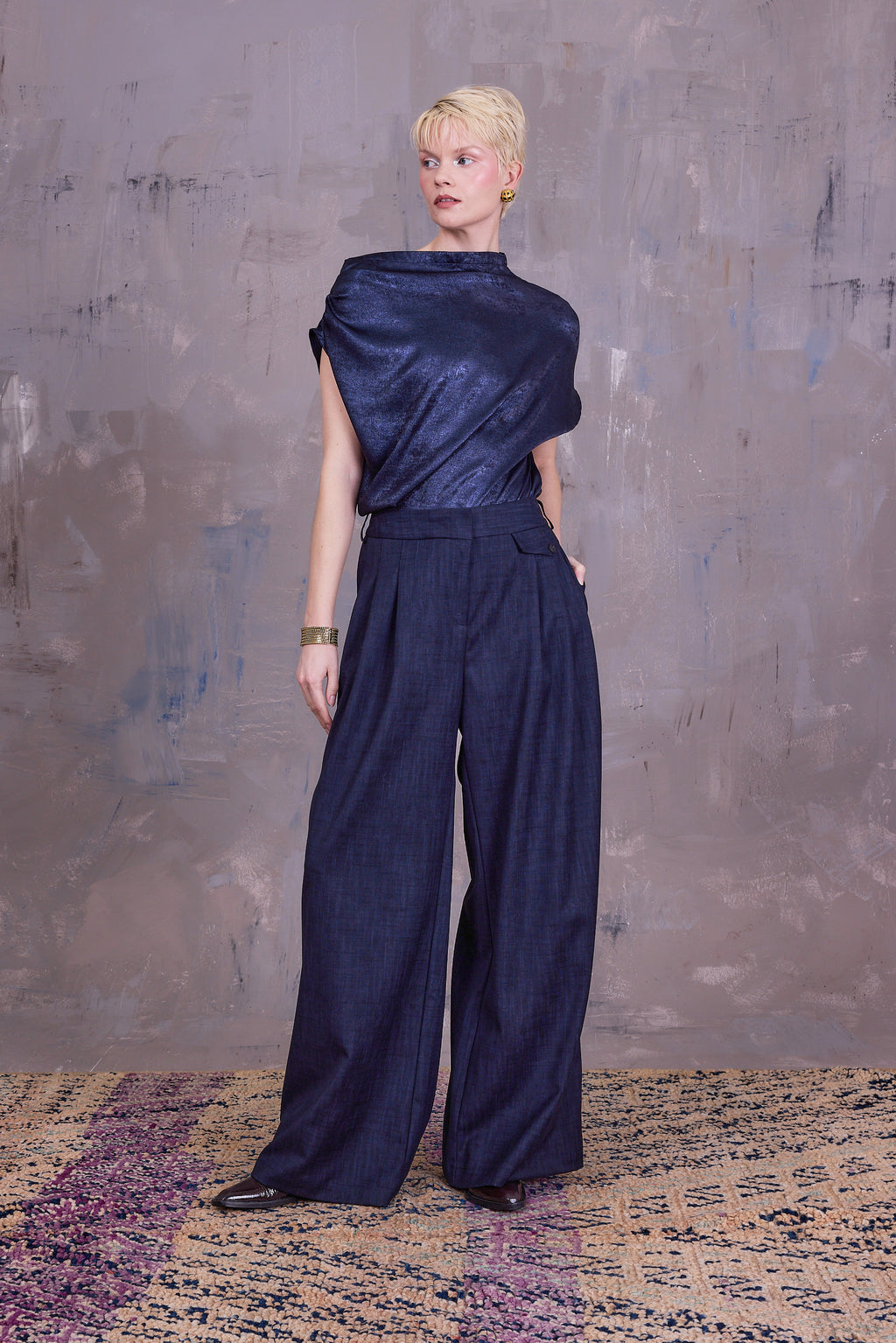 Guy est le nouveau pantalon palazzo incontournable avec sa longueur et son volume généreux au niveau des jambes et sa taille élégante. Son rabat surélevé suggère une poche et le rend immédiatement reconnaissable.. Réalisé dans le twill fin bien connu : un tissu fluide et résistant, qui ne se froisse pas et demande peu d'entretien. La couleur bleu profond est mélangée en différentes nuances de bleu.