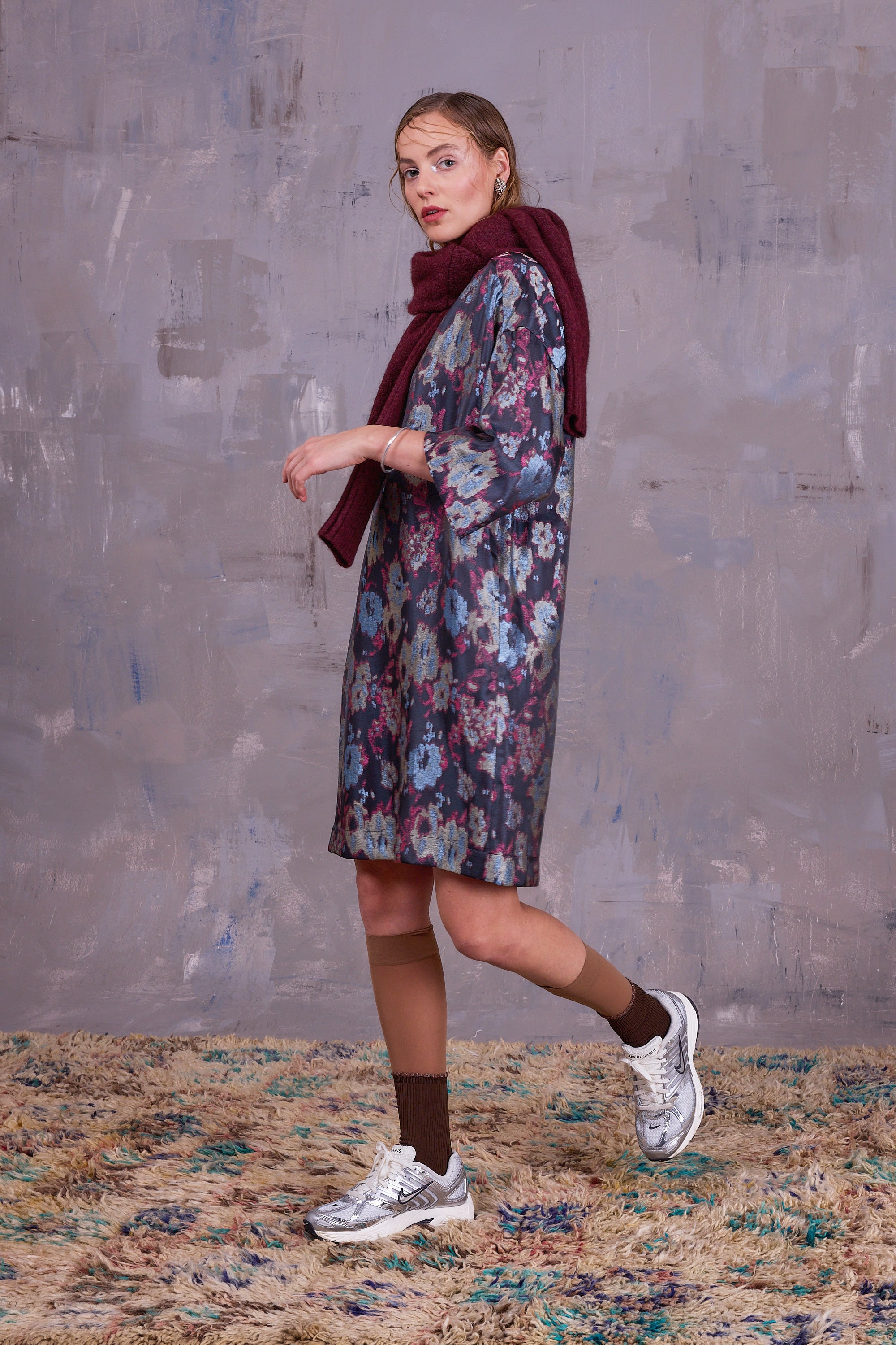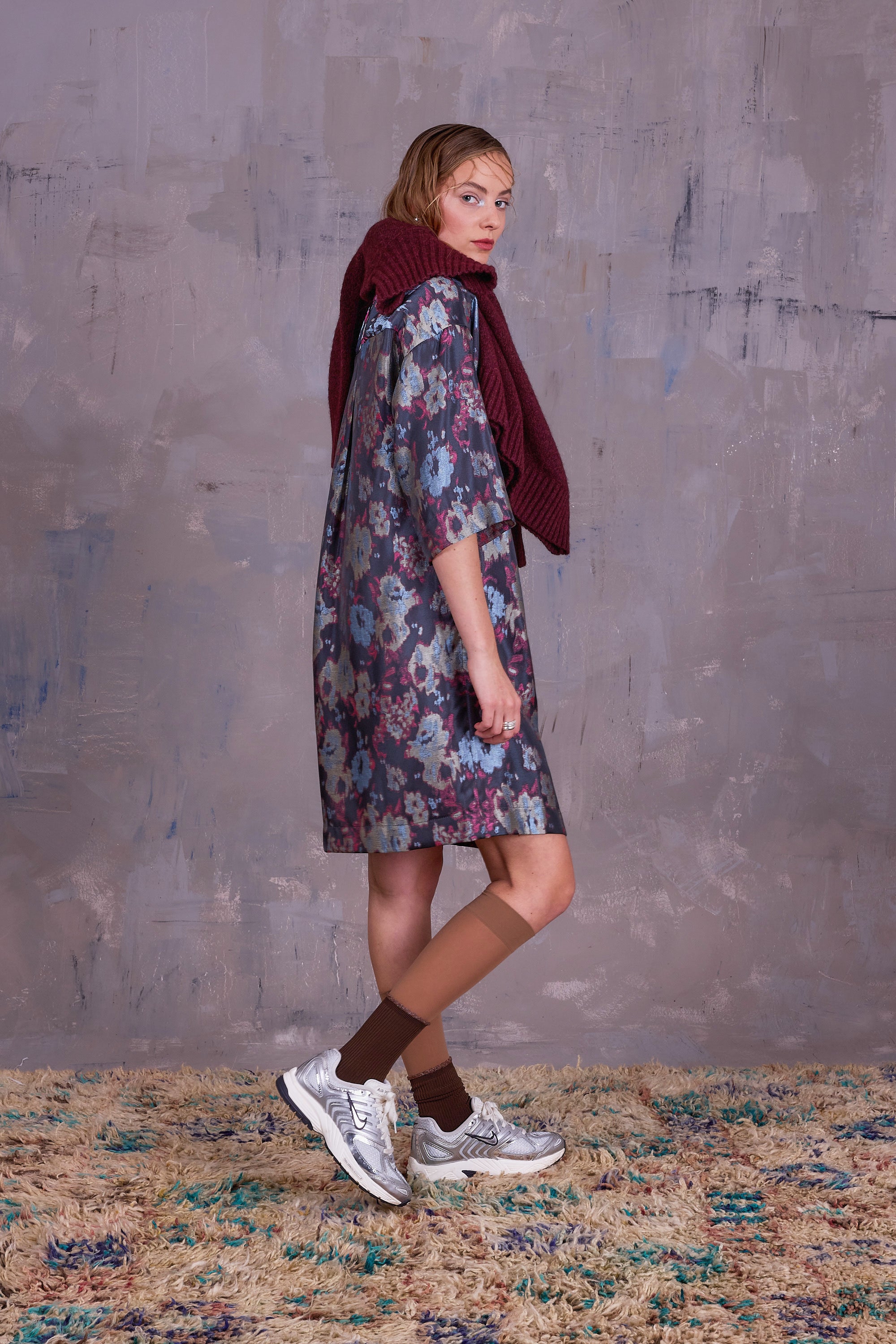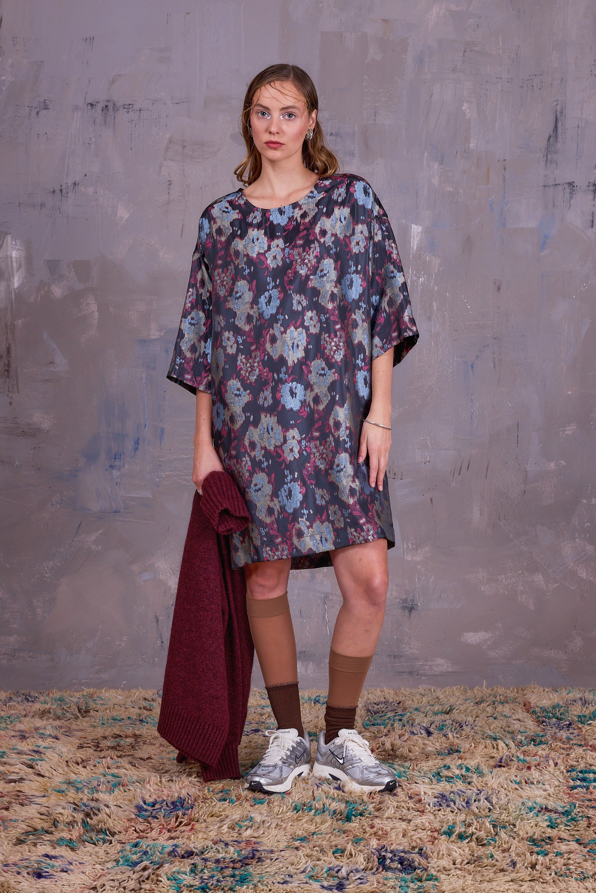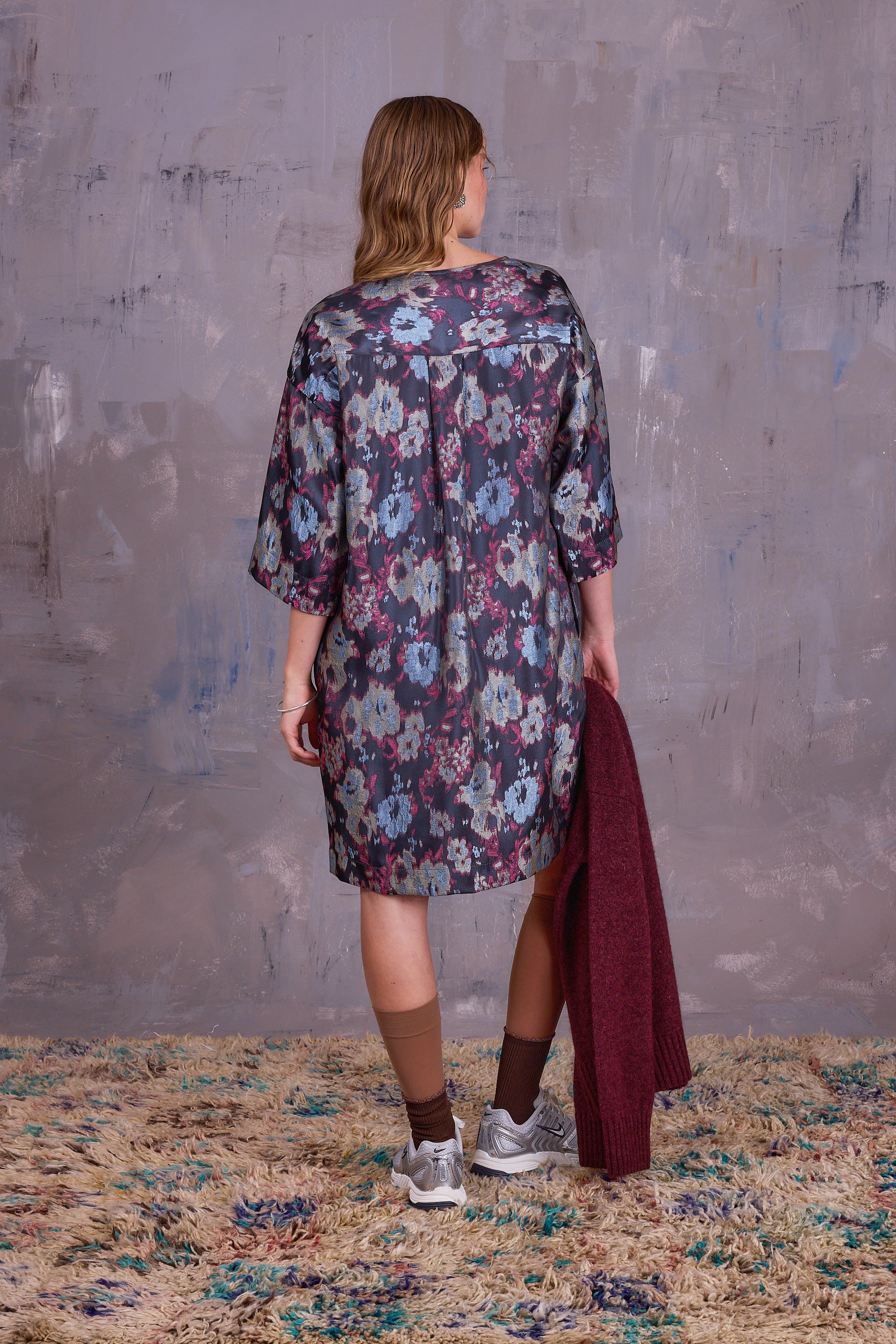 Robe ample dans un tissu jacquard souple avec des dessins abstraits dans de belles nuances de couleurs allant du bleu ciel au rose framboise sur un fond gris foncé.