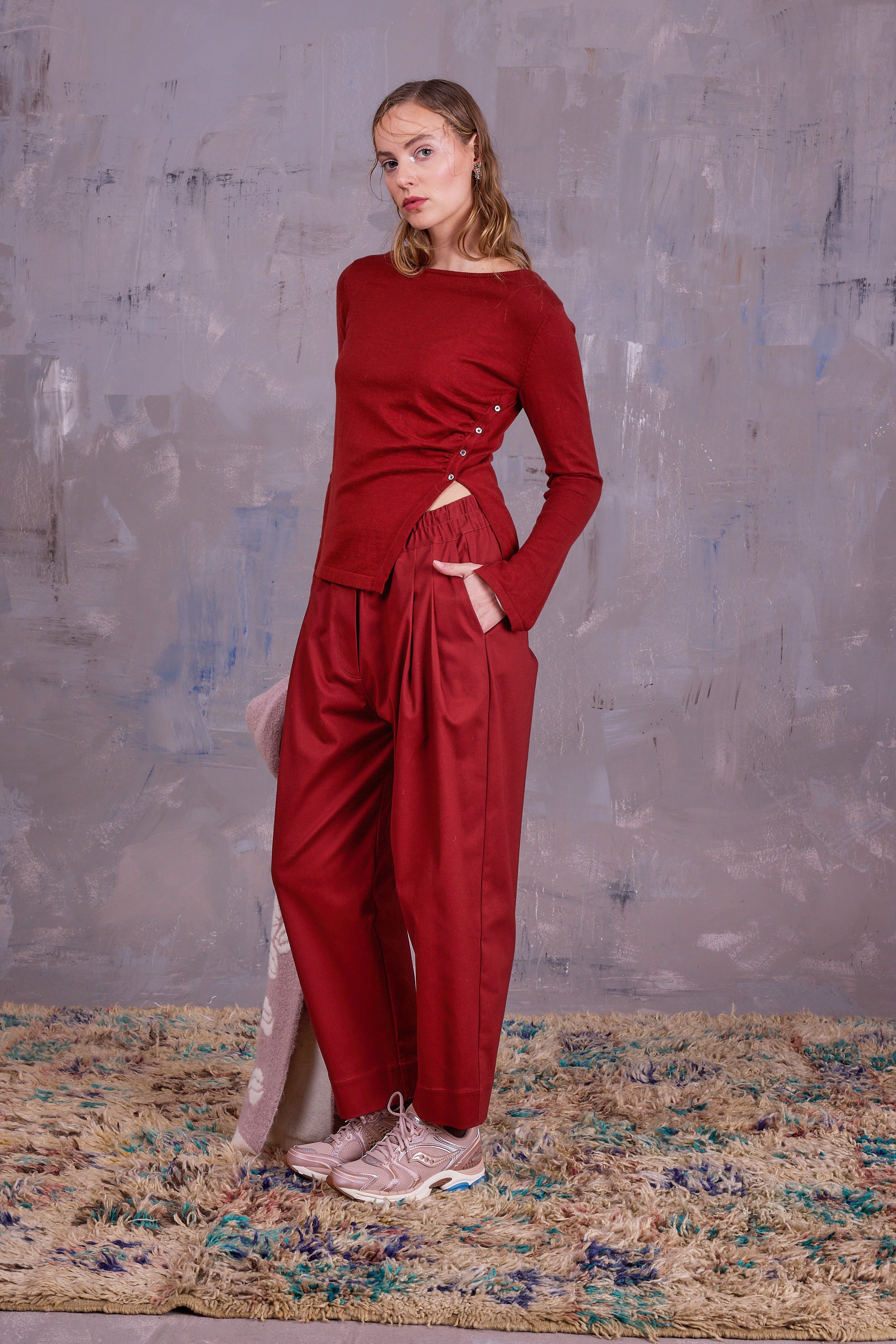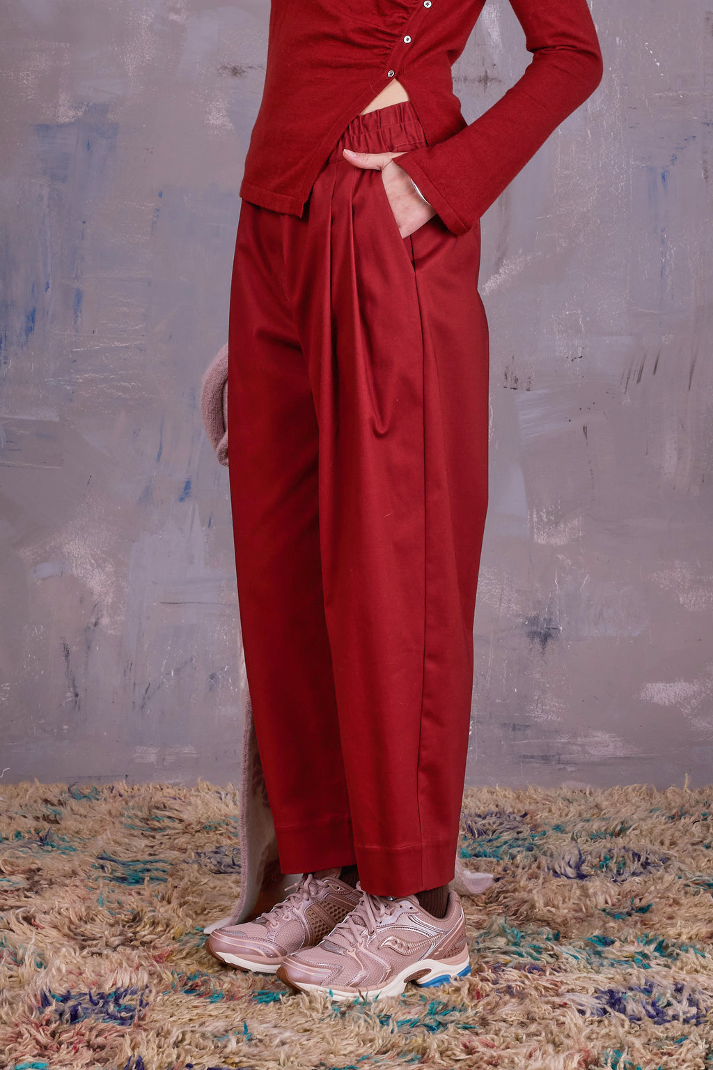 George est un nouveau modèle avec jambe barrel. Il présente une large ceinture élastique, deux plis de chaque côté partiellement cousus, et une jambe plus étroite en bas, laissant la cheville apparente.