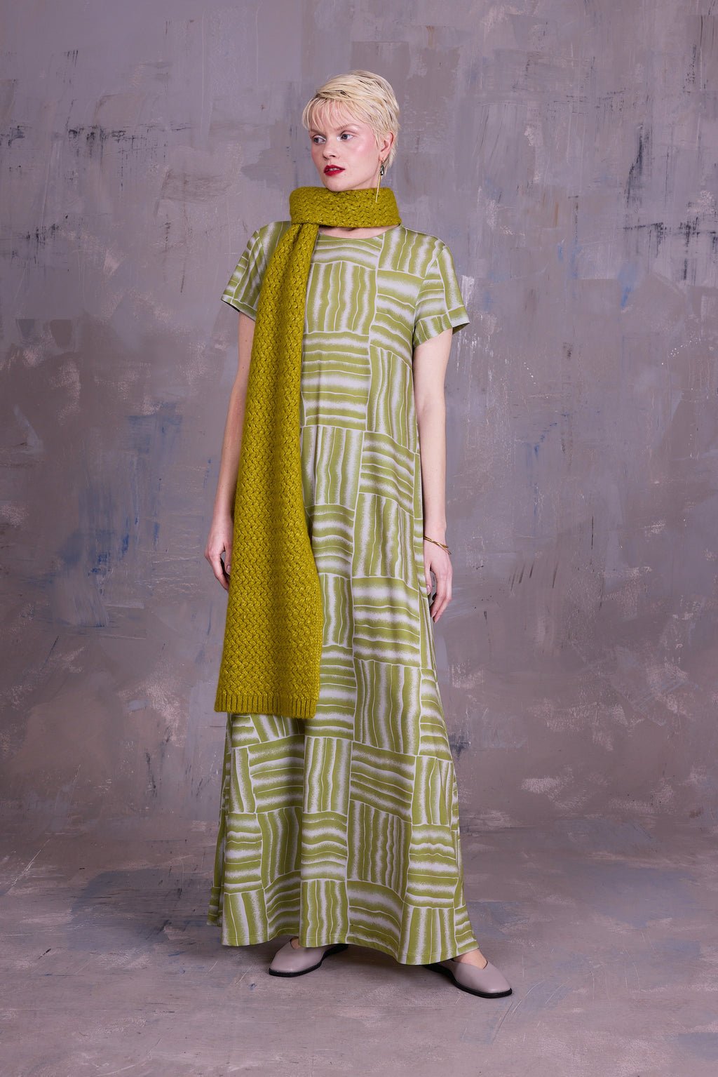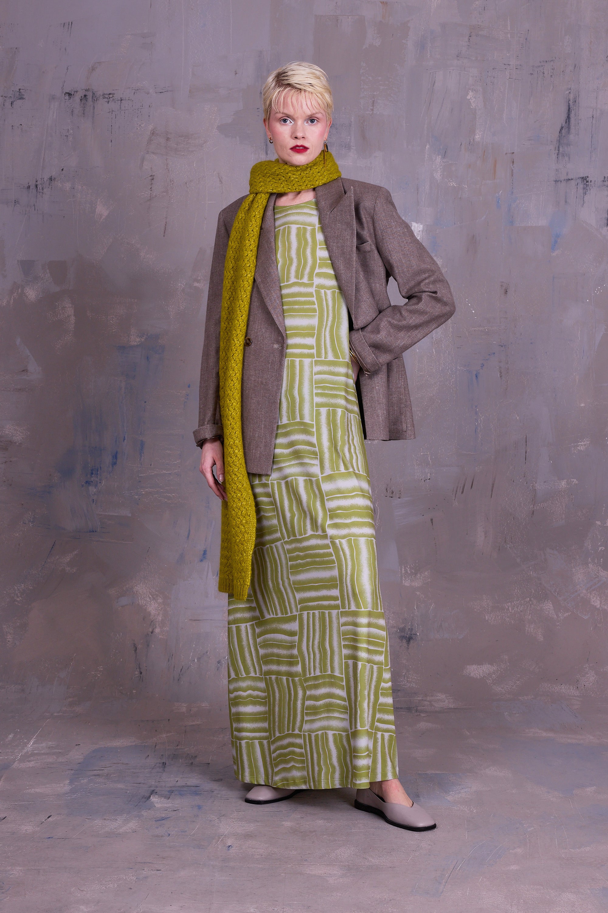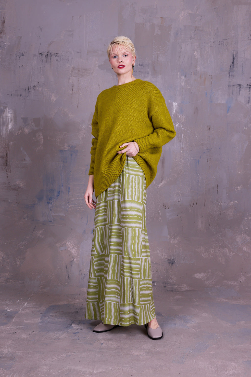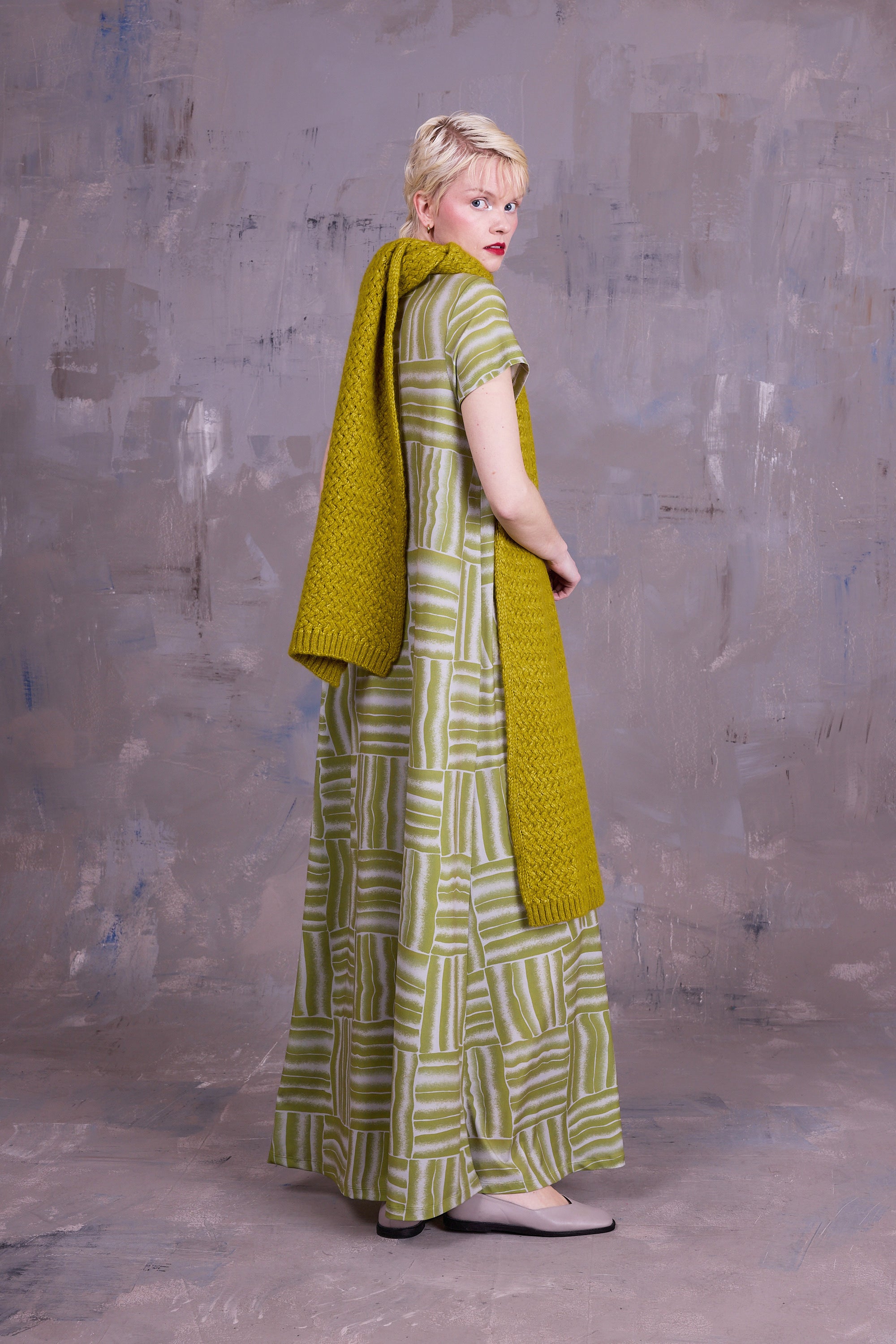 Lange jurk met ronde hals, passend bovenaan, maar met groot volume in de rok. Ciska is een prachtig canvas voor de grafische print die ontwikkeld werd in eigen atelier.