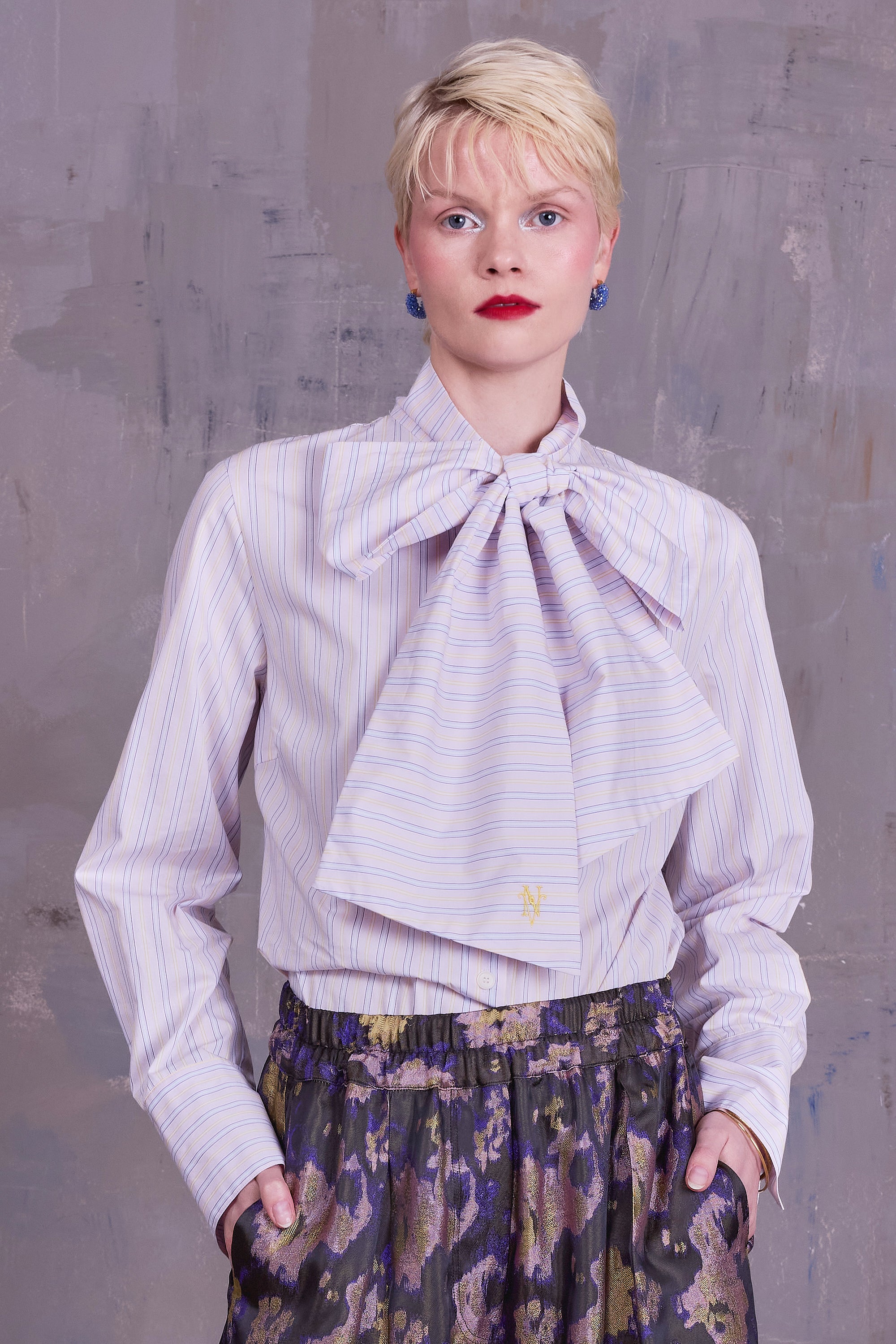 Niet elk hemd maakt een statement, maar Gilou zeker wel. Geen alledaags kraagje, maar een lange aangezette sjaal om een bombastische strik mee te maken. More is more.