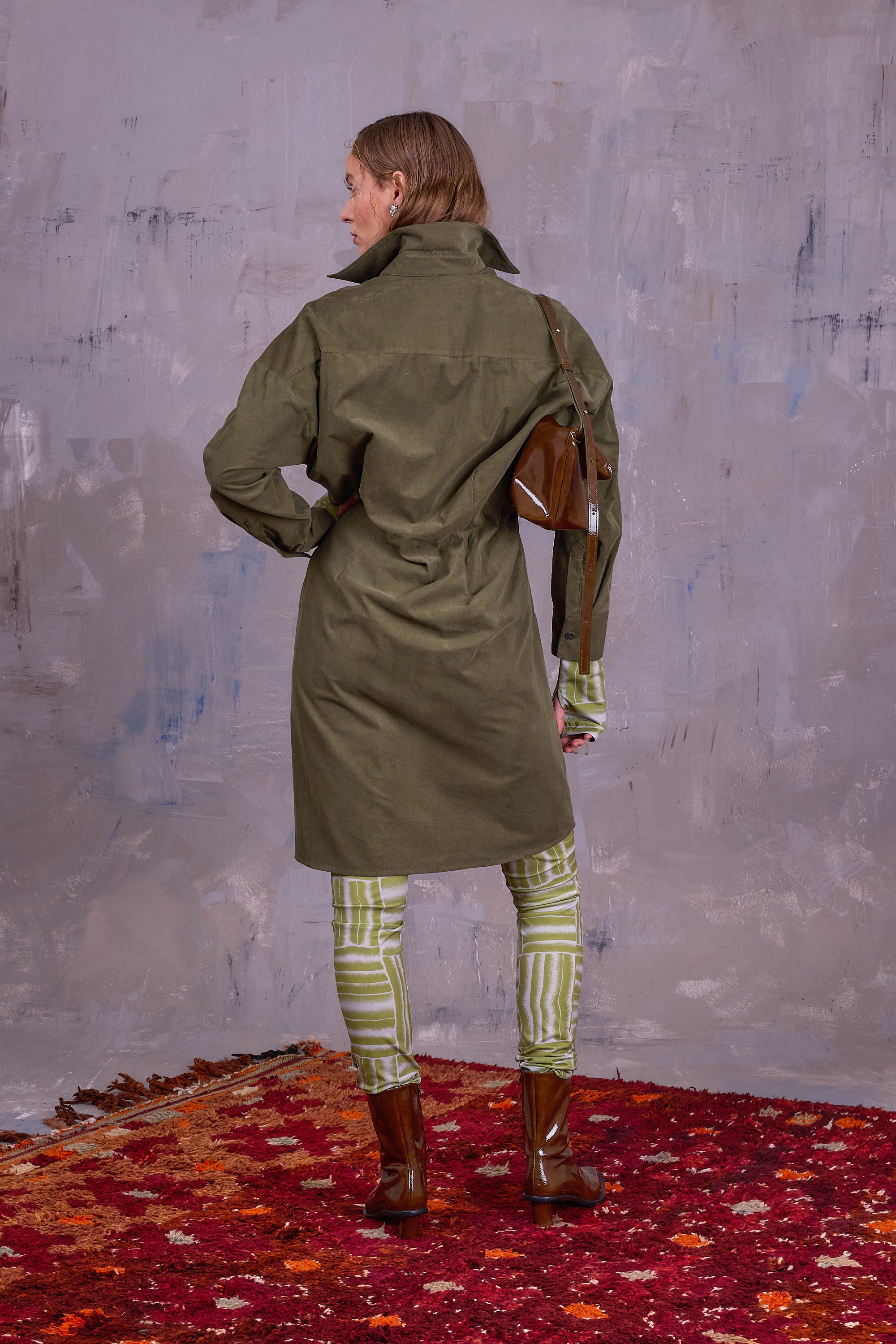 De Gardena jurk is typerend voor Nathalie Vleeschouwer: comfortabel en met attitude, maar ook verrassend: je knoopt deze jurk in micro ribfluweel atypisch gekruist, waardoor een asymmetrisch effect ontstaat. Ze heeft een elegante pasvorm.