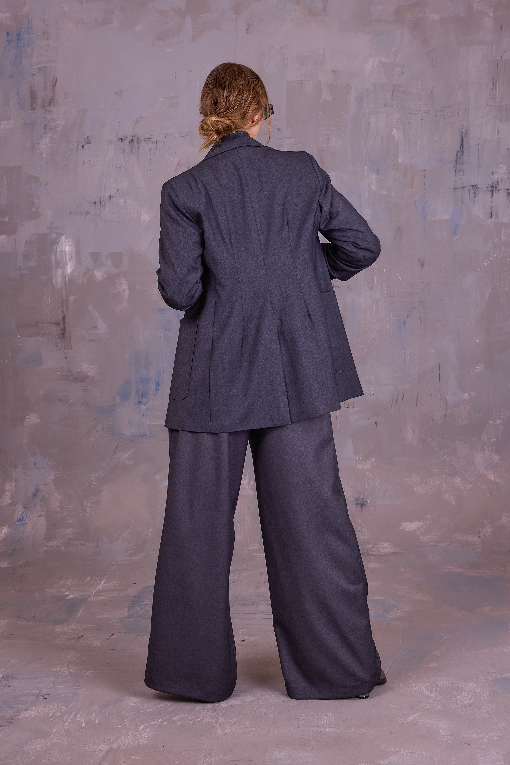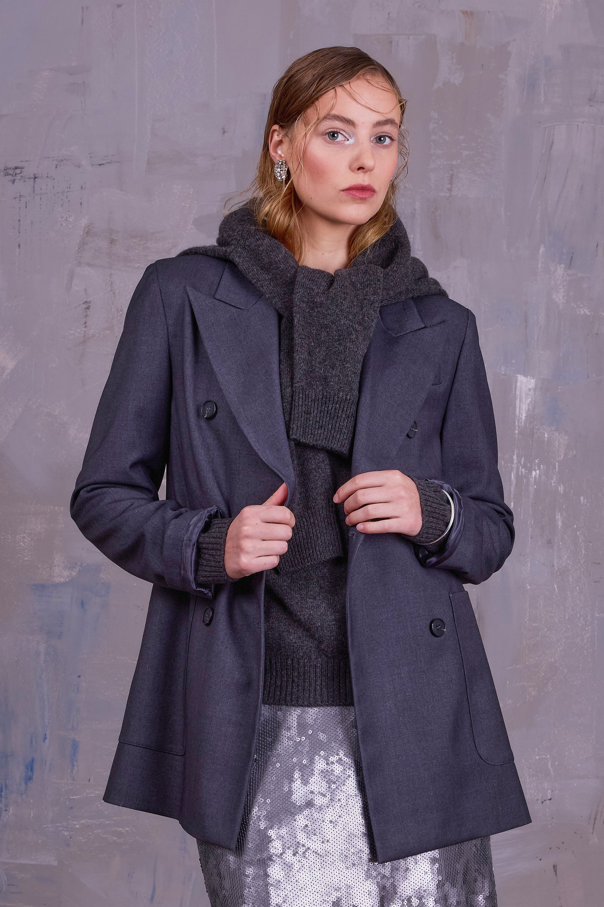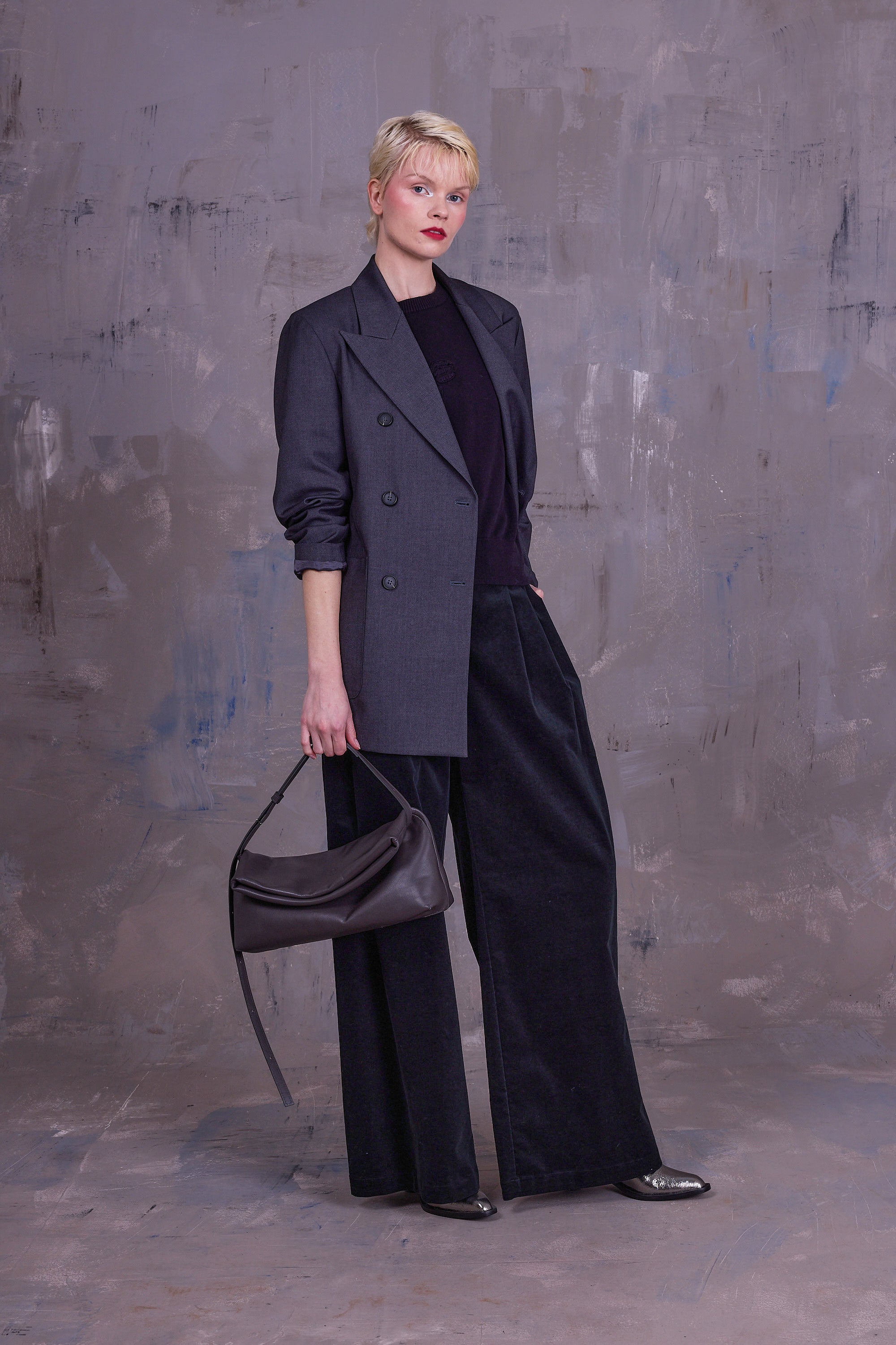 Nathalie Vleeschouwer is gekend om haar 'full look suits' en daarbij krijgt nieuw model Glenn meteen een hoofdrol. Deze getailleerde double breasted blazer heeft een uitgesproken knoopsrij, brede revers en valt lang.