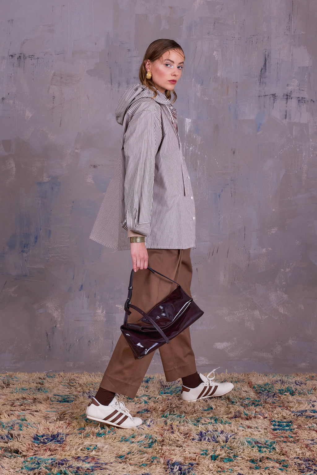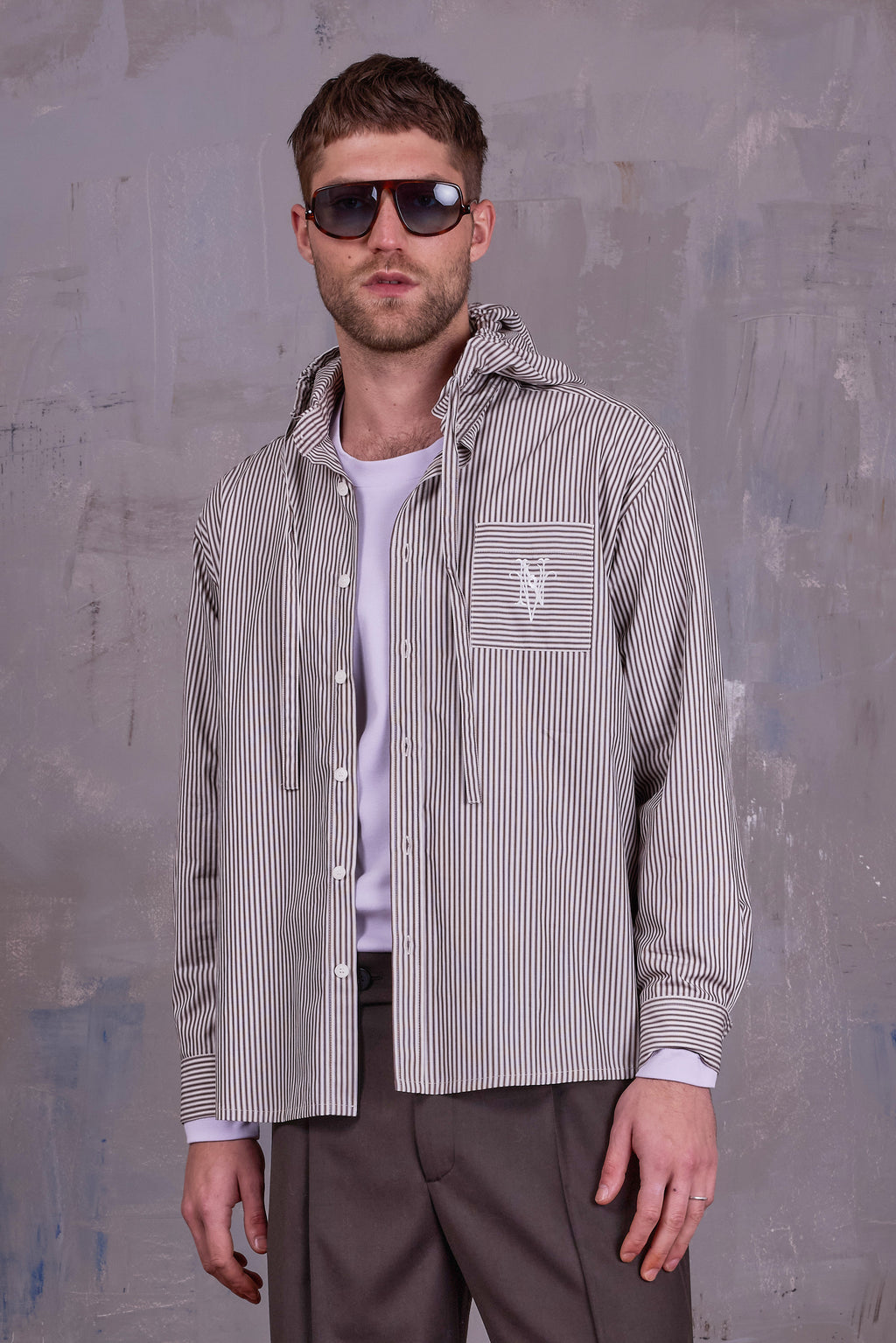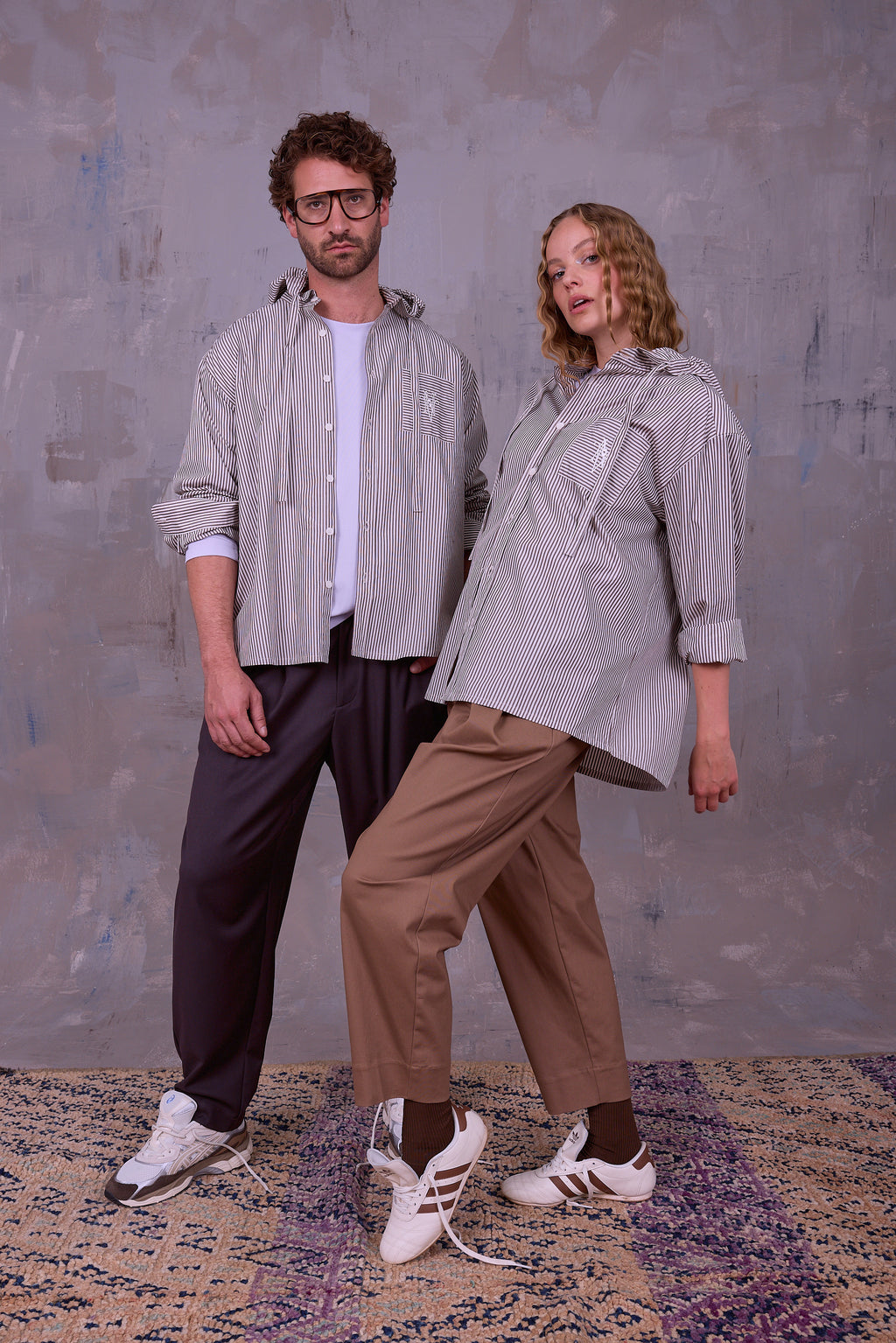 Gonzola is niet het zoveelste hemd in een dozijn. Met zijn uniseks, losse pasvorm en kenmerkende kap onderscheidt het zich qua pasvorm, maar ook de stof is bijzonder. Het is gemaakt van vintage cotton stripes, een katoenen stof met preppy cool allures, die nog meer versterkt worden door het zwierige geborduurde NV-embleem op de borstzak.