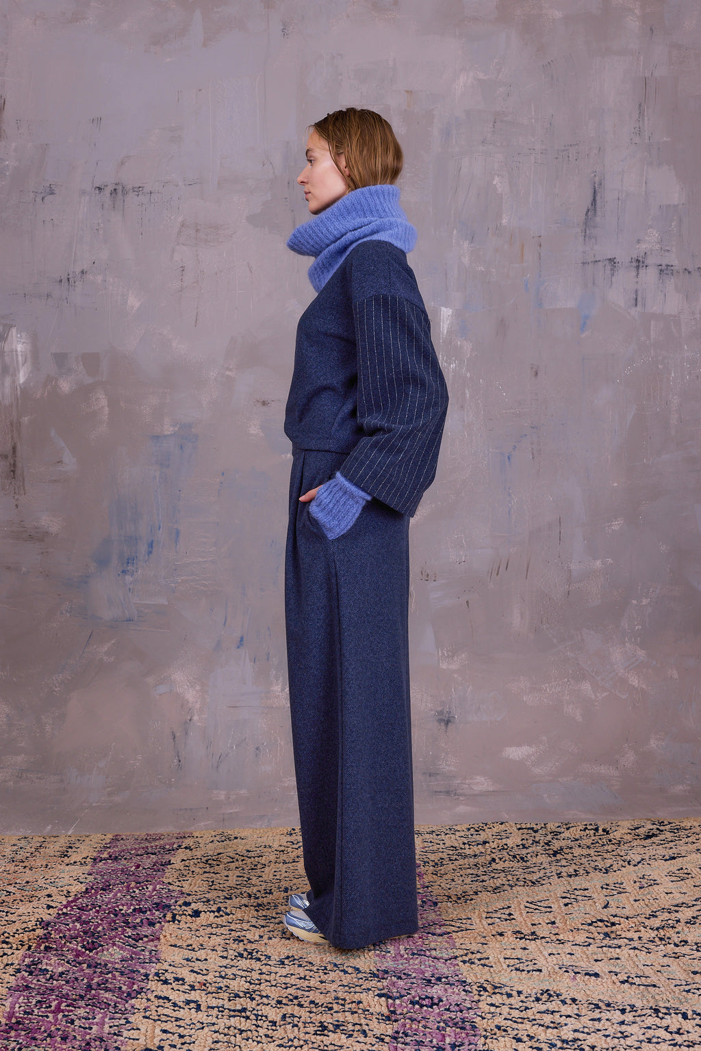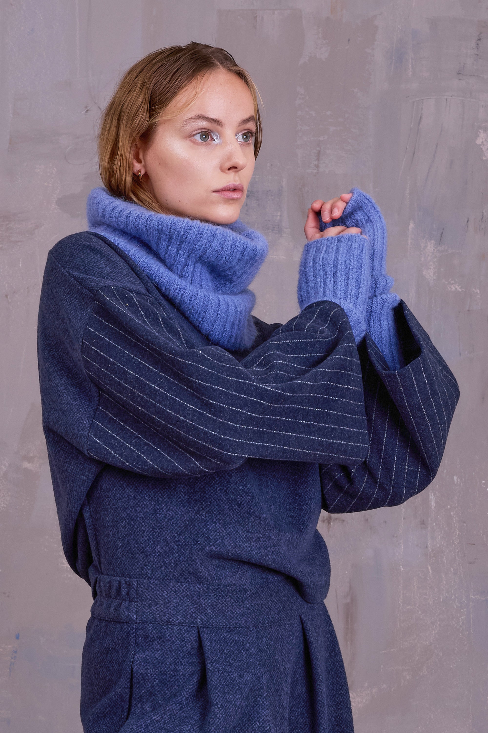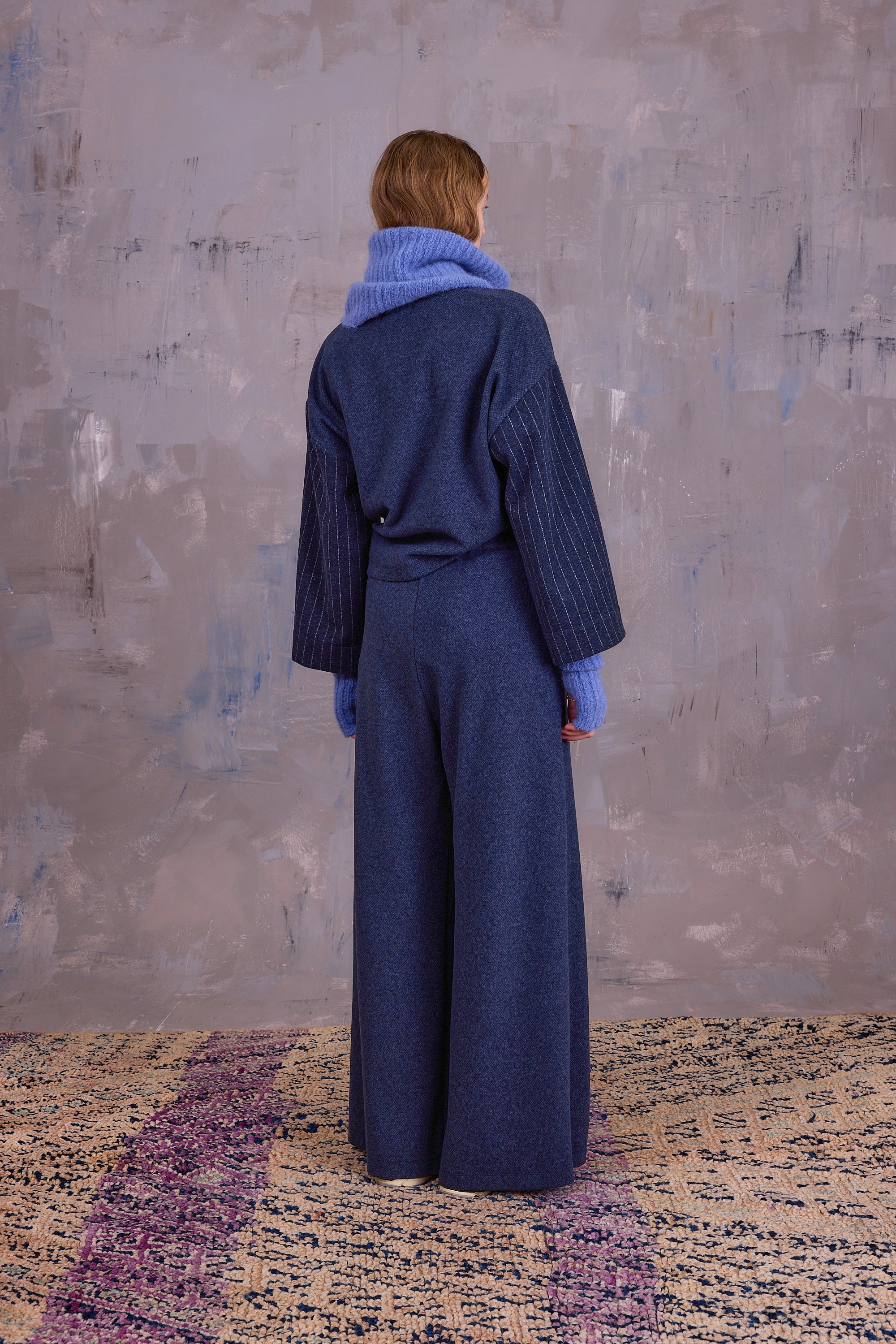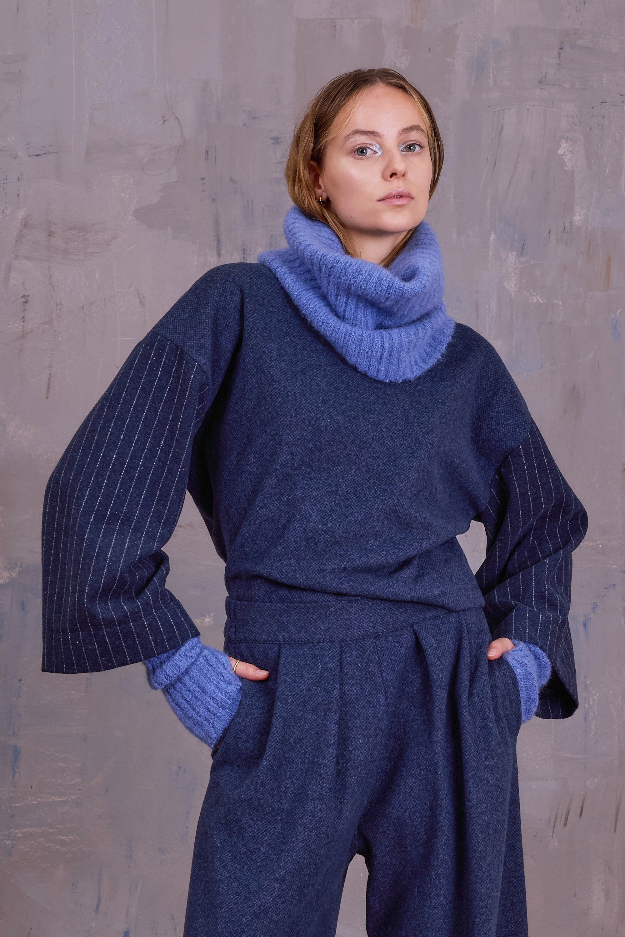 Deze sweater is een instant hit: Nathalie weet hoe ze sweaters moet maken die comfortabel zijn én ook gekleed. Ed heeft een trompetmouw met fijne krijtstreeptekening die een optisch verlengend effect geeft. Combineer met broek Egbert of Gio tot een complete set.
